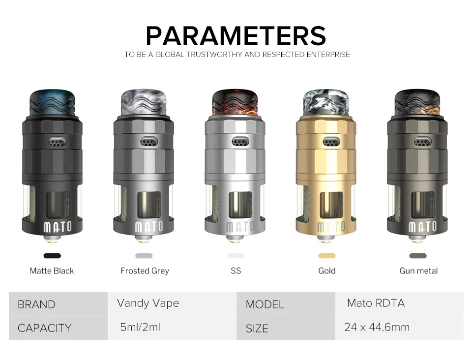 Представляем RDTA Vandy Vape Mato. Он имеет емкость 5 мл/2 мл и поддерживает как нижнюю, так и боковую перекладку. Поставляется с направляющей из стальной катушки, 4 стальных провода обеспечивают невероятный поток сока. Кроме того, конструкция одной катушки обеспечивает большое пространство для установки катушки и очень легко заменить катушку. RDTA совместим с 510 и squonk pin, у него отличная система воздушного потока, которая определенно улучшает аромат и облака.