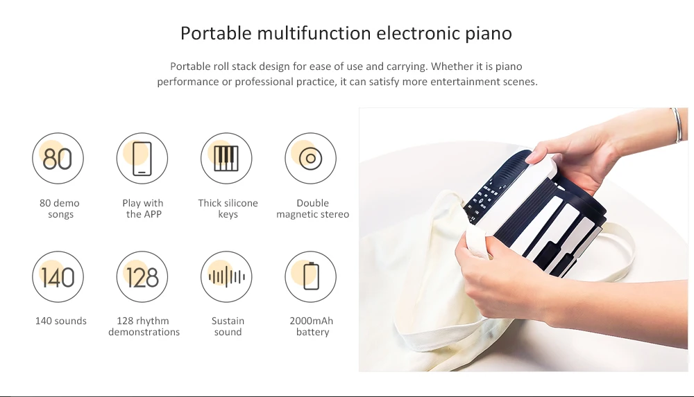 Основные Особенности: ● Двойной Магнитный стерео для восстановления звука высокого качества ● Портативный свернутый дизайн для удобства использования и переноски ● Толстые силиконовые клавиши, отзывы о новом дизайне, реальное прикосновение; Клавиатура оснащена независимой сенсорной областью, а определение чёткого и точного. ● Приложение для подключения Bluetooth Он может подключаться к мобильный телефон bluetooth. Поддерживает Оригинальное музыкальное сопровождение, чтобы играть в соединение, вы также можете достичь онлайн-обучения через программное обеспечение, нулевой основе также может завершить Самообучение. Поддержка функции ввода микрофона для достижения самостоятельного пения. ● Может использоваться в качестве перкуссии Встроенный 140 звуков, 128 демонстраций ритма, чтобы удовлетворить функцию воспроизведения большего количества инструментов и различных стилей музыки, указывая на функцию барабана клавиатуры, чтобы достичь барабана на клавиатуре. ● Большая энергия, пусть музыка продолжает работать Емкость аккумулятора 2000 мАч, зарядка USB/источник питания; Устойчивая производительность в течение 15 - 20 часов при полной мощности. Технические характеристики: ● Звук: 140 видов ● Ритм: 128 видов ● Демонстрационные песни: 80 ● Выход USB: MIDI вход/выход ● Емкость аккумулятора: 2000 мАч (включая) ● Время: 15 - 20 часов (полностью заряжен) ● Время зарядки: 4 часа ● Номинальное напряжение: 5 В ● Bluetooth: BT4.0 ● 88 ключ: 138x22x2 см ● 61 Ключ: 100x22x2 см Номер модели: Vvave Тип K: Барабанный барабан Материал: смола Структура: Другое Номер ключа: 61,88