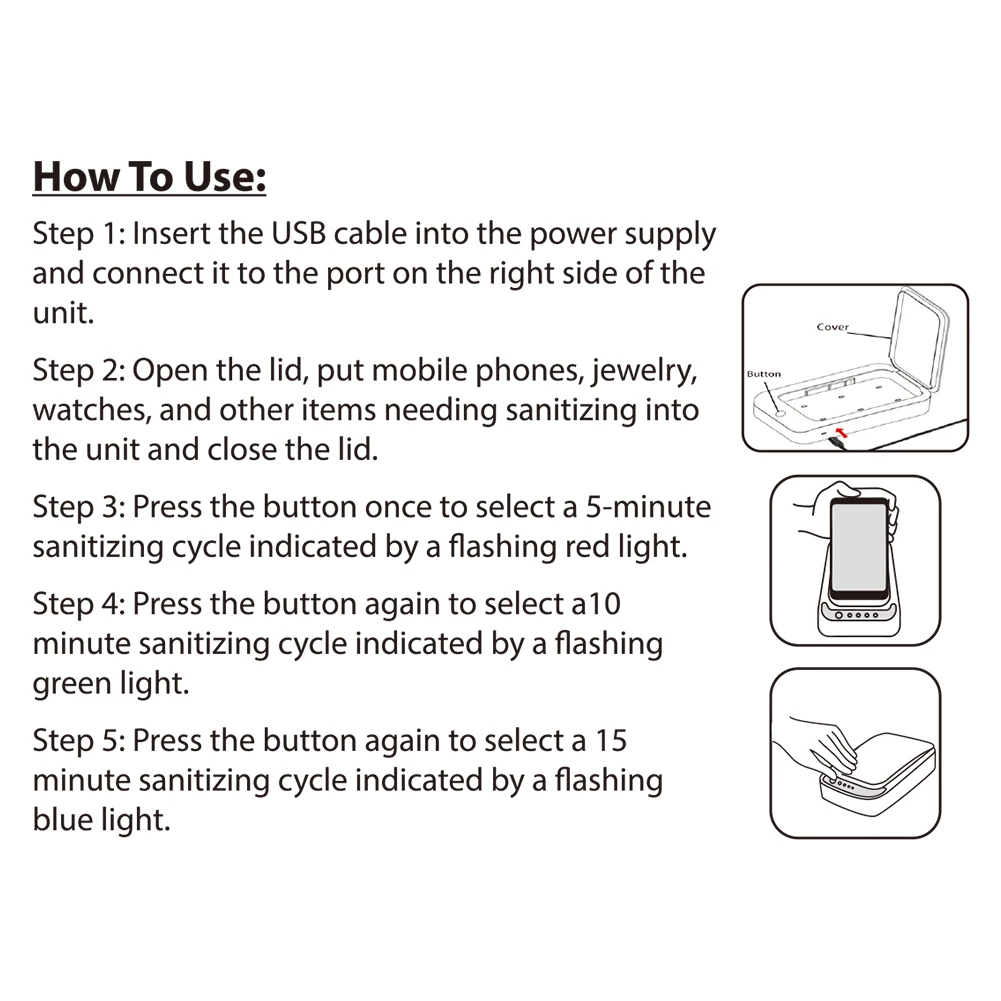 -Однокнопочная УФ-стерилизация, дезинфекция необходимых предметов: ювелирные изделия, ключи от автомобиля, маски и другие предметы, электронные предметы, такие как мобильные телефоны, мыши, пульты дистанционного управления, зубные щетки, косметические кисти и другие личные туалетные принадлежности.