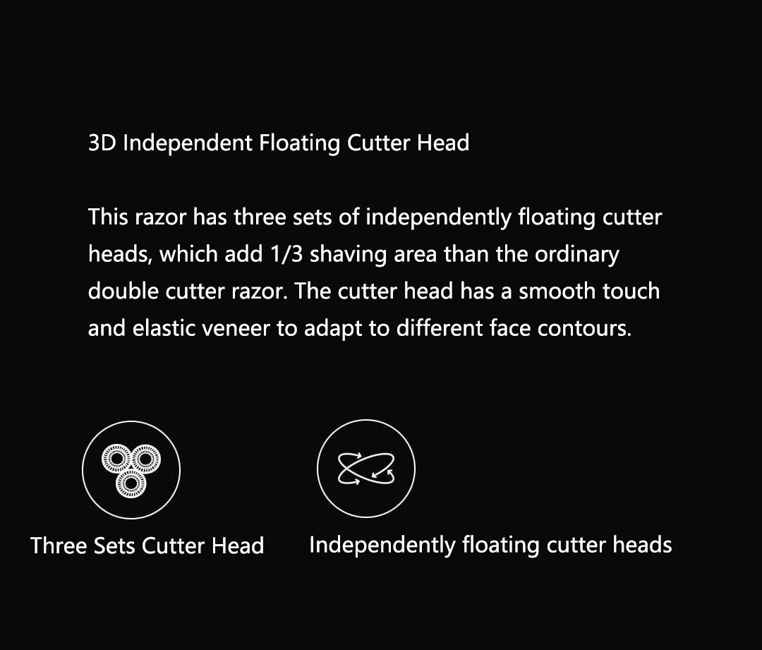 3D Независимая плавающая режущая головка Эта Бритва имеет три набора независимо плавающих режущих головок, которые добавляют 1/3 площади бритья, чем обычная двойная бритва. Режущая головка имеет гладкий и эластичный шпон, чтобы адаптироваться к различным контурам лица.