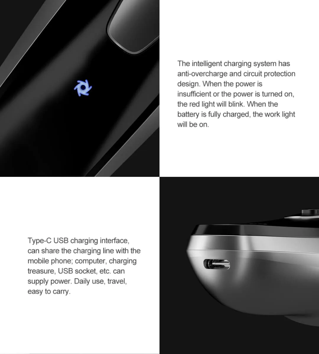 Интеллектуальная система зарядки имеет дизайн защиты от перезарядки и замыкания. Когда питание недостаточно, или если питание будет недостаточно, или включится красный светильник, мигнет. Когда аккумулятор полностью заряжен, будет включен рабочий светильник. Интерфейс USB Type-C для зарядки, можно использовать через мобильный телефон, компьютер, зарядное устройство, разъем USB и т. д. Можно подключать к электросети. Ежедневное использование, travle, легко носить с собой