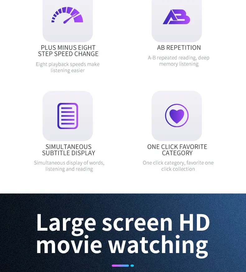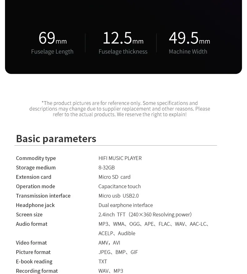 Описание памяти: 8 г = встроенный 8 г 16 г = Встроенный 16 г 32 Гб = встроенная карта TF 16 ГБ + 32 ГБ 40 г = Встроенная TF-карта 8 ГБ + 32 ГБ 64G = Встроенная TF-карта 8 ГБ + 64 ГБ 128 ГБ = встроенная карта TF 16 ГБ + 128 ГБ Корпус: сплав цинка Дисплей: 2,4 дюйма Разрешение экрана: 126*160 Размеры: 69*49,5*12,5 мм Память: 8 г/16 г Функция Bluetooth: Bluetooth 5,0. Поддержка подключения Bluetooth-гарнитуры и bluetooth-динамика. Воспроизведение музыкального фона: Поддержка Синхронизация лирики LRC: Поддержка Режим воспроизведения: повтор, одна игра, все петли Функция tf-карты: Поддержка макс. карты памяти 128 ГБ Воспроизведение переменной скорости: 8 раз переключение Видео Формат AVI Разрешение 320*240 Громкоговоритель: Поддержка Функция радио: поддержка, поддержка ing записи Будильник: поддержка Секундомер: Поддержка Текстовое чтение: Формат TXT, поддержка закладок Аккумулятор: полимерный аккумулятор 500 мА Функция записи: Поддержка записи микрофона, формат поддерживает MP3 Время работы: 20 часов воспроизведения песен в режиме экономии экрана наушников. Видео воспроизводит в течение 3-5 часов. Язык: английский/русский/японский/Корейский/французский/немецкий/Турецкий/итальянский/голландский/Португальский/Испанский/Шведский/Чешский/Датский/Польский/тайский/Датский/Римский/арабский/Греческий/И других языков более 20 стран. Формат аудио: APE, AAC, FLAC, MP3, WMA, OGG. Важное примечание для Bluetooth: 1. Можно подключать только к bluetooth-наушникам или bluetooth-колонкам, а не к мобильным телефонам или компьютерам. 2. Не может прослушивать радио через Bluetooth. Пожалуйста, прочтите радио через наушники. 3. Не подходит для передачи данных. 4. Как использовать Bluetooth? Пожалуйста, используйте наше устройство для поиска Bluetooth-устройств, таких как Bluetooth-наушники. Затем «проигрывайте всю музыку» Список продуктов: 1 х музыкальный плеер 1 X Руководство пользователя 1 X USB кабель Наушники-1 шт.