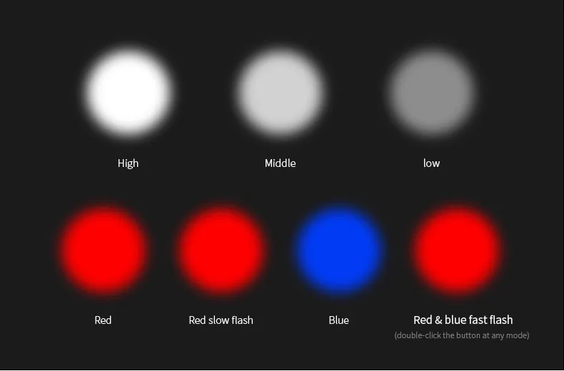 Красный и синий светильник (правая клавиша питания): красная/красная медленная вспышка/синяя/красная быстрая вспышка (дважды нажмите кнопку в любом режиме)/Выкл (удерживайте кнопку в течение 2 секунд в любом режиме)