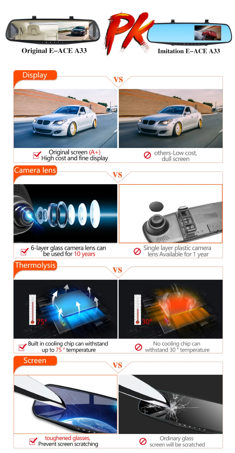 О: Мы лидер бренда с номером топа. 1 заказы на данном цифровом видеорегистраторе зеркало от года 2016, и мы используем только полную 6 слоев объектива камеры заднего стекла все время. некоторые перепродавцы используют пластиковый объектив камеры. но если вы используете пластиковый объектив камеры Dvr, Видео и картинка размыты при горячей температуре, потому что пластиковый объектив будет термо-искажением.