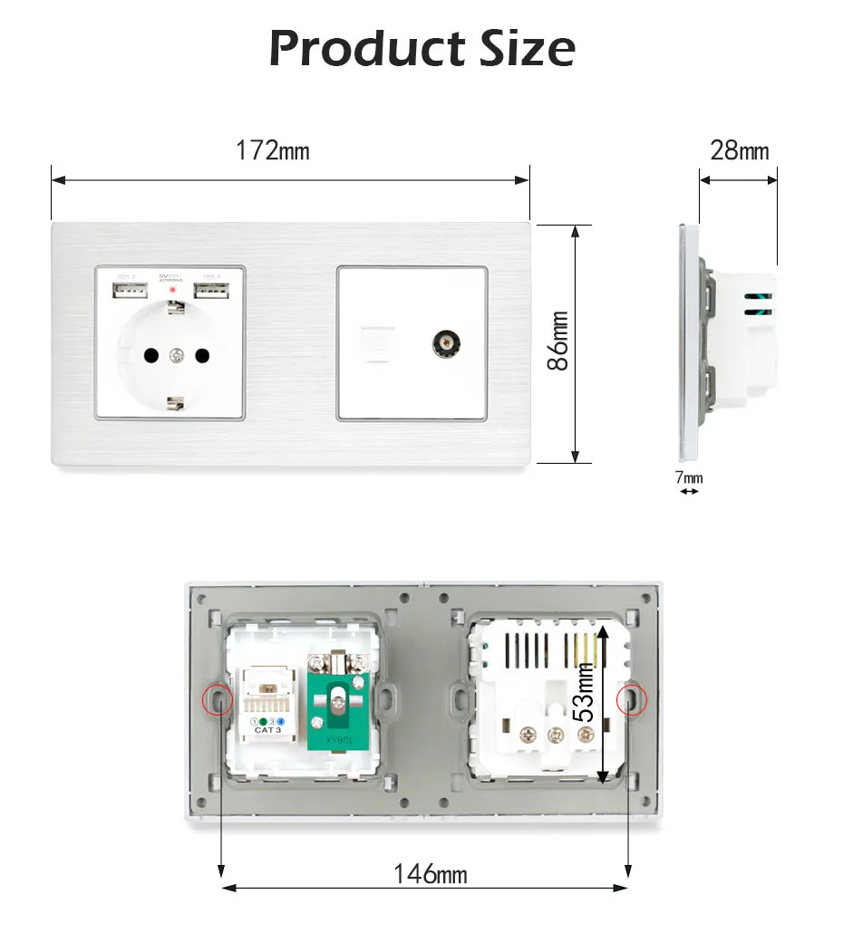 Разъем UNKAS с алюминиевой металлической панелью европейского стандарта с USB + 1 Женский Разъем для телевизора с разъемом CAT5E RJ45 для передачи данных через Интернет