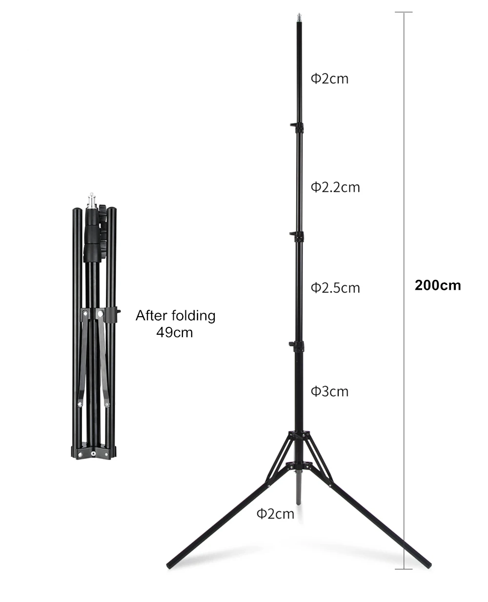 Максимальная рабочая высота: 200 см/79 дюймов Минимальная высота складывания: 49 см/19 дюймов Вес нетто: 0,885 кг Максимальный вес-3 кг Материал: алюминиевый сплав Подходящий товар: используется для отражателя зонта, софтбокса, фото освещения и некоторых фото оборудования