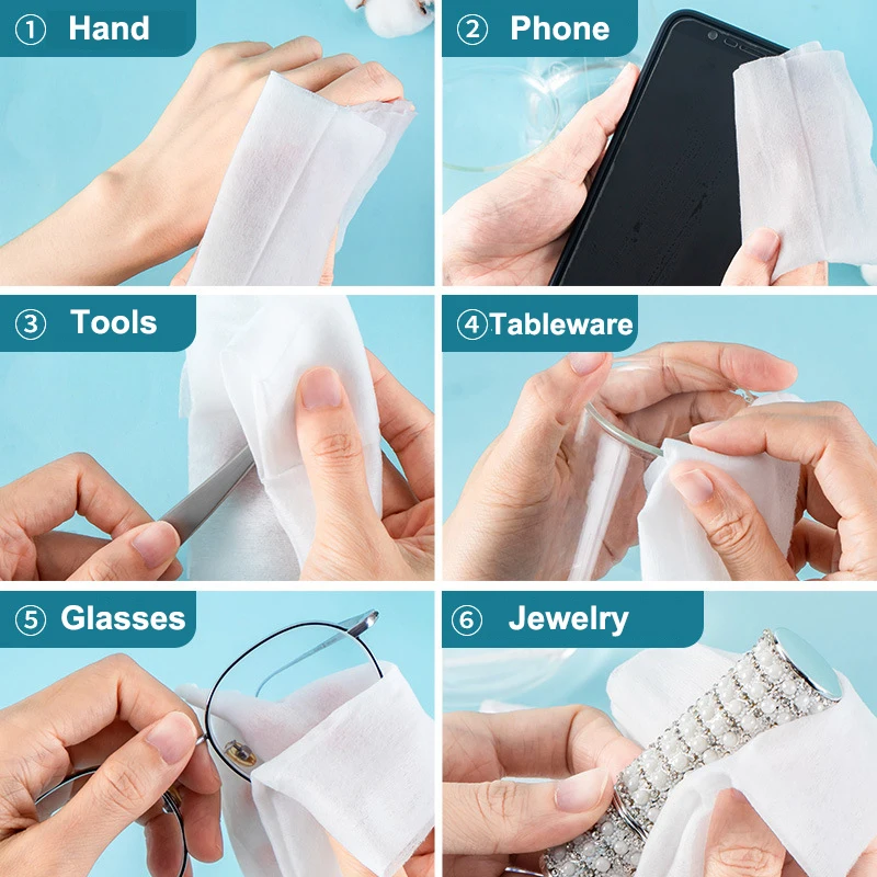 1. Нетканые материалы, безопасные и не раздражающие 2. Не содержит флуоресцентных веществ и консервантов 3. Хороший эффект стерилизации, легко носить с собой 4. Может использоваться для дезинфекции кожи, вокруг ран и перед инъекцией 5. Для очистки и дезинфекции клавиатуры, мобильных телефонов, офисных принадлежностей, предметов для переноски, посуды, детских игрушек и т. д. 6. Аварийная дезинфекция небольших ран, таких как открытый туризм, кемпинг, плавание и т. д.