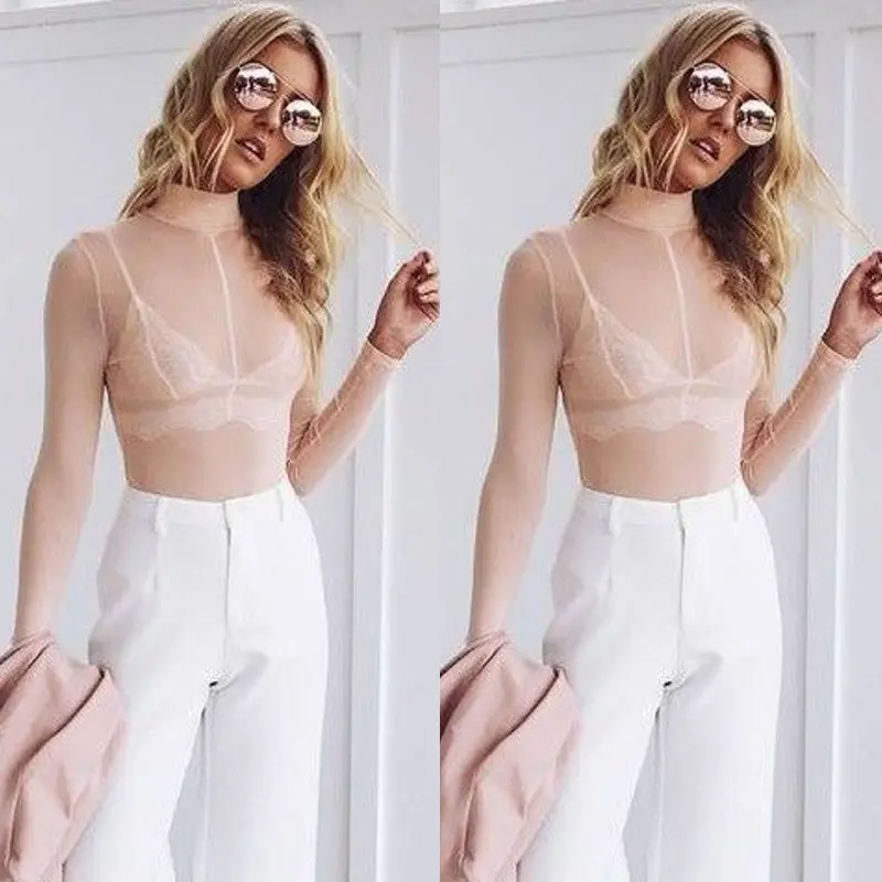 Hirigin женские сетчатые Топы с длинным рукавом и круглым вырезом, чистый цвет, Прозрачная Тонкая облегающая эластичная рубашка, черный, розовый