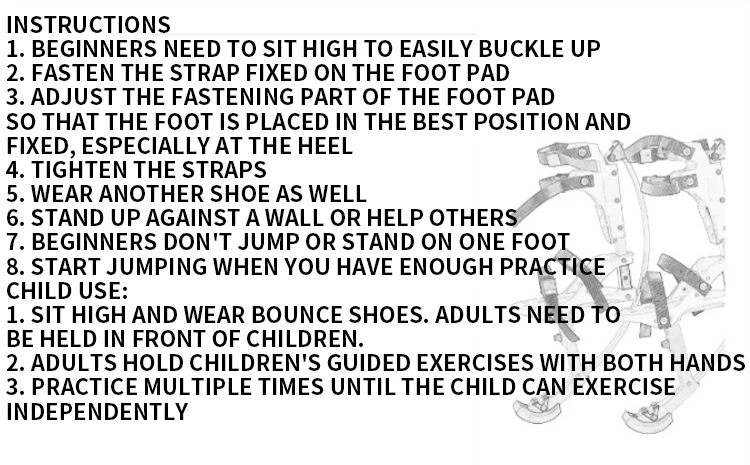 Название: детская обувь с отскакивающим эффектом Вес: 5 кг Грузоподъемность: 30-50 кг Размеры: 65*14*40 см Цвет: черный, красный, синий Инструкции 1. Новичкам необходимо сидеть высоко, чтобы легко пристегнуть 2. Пристегните ремень, фиксированный на ножной ножке 3. Отрегулируйте крепежную часть стопы так, чтобы стопа была установлена в наилучшем положении и фиксирована, особенно на пятке 4. Затяните ремни 5. Носите и другую обувь 6. Встаньте у стены или помогите другому 7. Новички не прыгают и не стоят на одной ноге 8. Начните прыгать, когда у вас будет достаточно практики Ребенок должен им пользоваться: 1. Высокая посадка, надежная обувь. Взрослые нужно держать в передней части для детей. 2. Взрослые держат детей управляемыми упражнениями двумя руками 3. Тренируется несколько раз, пока ребенок не сможет упражняться независимо