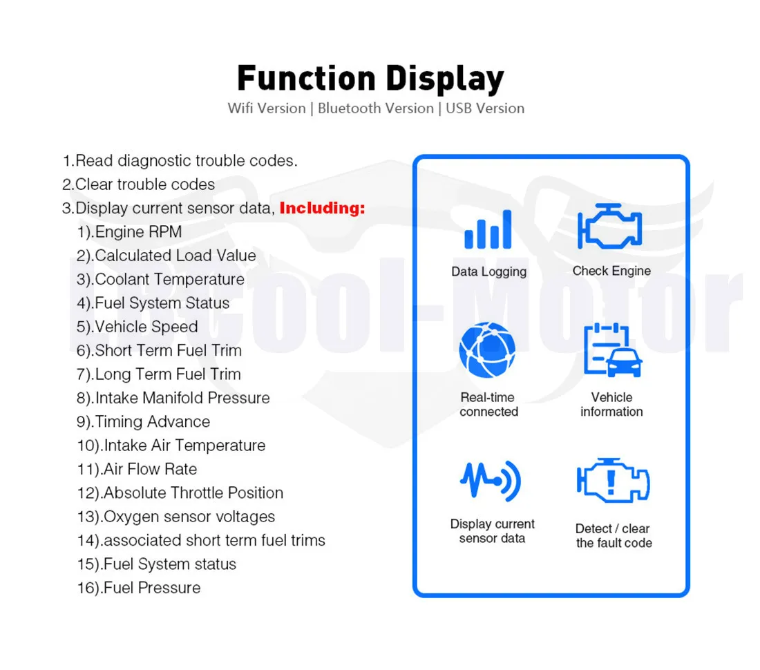 1.Type1-Type4 ELM327 BluetoothChip PIC18F25K80 (Supprts ATAL/ATTP/ATNL) Type5-Type7 ELM327 wifiChip PIC18F25K80 (Supprts ATAL/ATTP/ATNL) 2. ELM327 funcionara con vehinculos de gasolina y diésel de 12 V que requieren protocolos OBD II. 3. Система поддержки: Versión Bluetooth ------ admite teléfono android/PC ----- se conecta a través de bluetooth 4. Вариос Idiomas: Русо, чеко, данес, АЛЕМАН, Инглес, Эспаньол, франкис, кроата, хунгаро, Итальяно, полако, сербио, турко и т. Д. (El idioma cambia con el sistema operativo) 5.La función: Lee códigos de problemas de diagnóstico, tento genéricos como especificos del fabricante, y muestra su signisiado (mus de 3000 definiciones de código genérico en la base de datos). Admite protocolos OBD 2 coche: 1 США coches después de 1998 r, para Chrysler, apto para Ford, apto para GM, ajuste para Jeep... 2 coches de la UE después de 2000 r, como Alfa Romeo, apto para SAAB, apto para Acura ......... 3. Coches de Japón y Corea después de 2002 r. Apto para KIA, apto para Isuzu, apto para Honda, apto para Mitsubishi, .......... 4. Coches de China después de 2005 r. 5. Coche ruso después de 2011 años. Протоколы estandar OBD2: 1 SAE J1850 PWM (41,6 кбод) 2 SAE J1850 VPW (10,4 кбод) 3. ISO9141-2 (5 бод, 10,4 кбод) 4. ISO14230-4 KWP (5 baudios, 10,4 кбод) 5. ISO14230-4 KWP (entrada rаpida, 10,4 кбод) 6 ISO15765-4 puede (11 бит ID 500 кбод) 7 ISO15765-4 puede (29 бит ID 500 кбод) 8 ISO15765-4 пууд (11 бит ID 250 кбод) 9 ISO15765-4 puede (29 бит ID 250 кбод) Un SAE J1939 puede (29 бит ID 250 * кбод) B. USER1 lata (ID de 11 бит, 125 * кбод) C USER2 CAN (ID de 11 бит, 50 * кбод) * Configuración predeterminada (ajustable por el usuario) Mostrar datos del sensor de corriente, incluyendo: 1 RPM del motor 2 valor de carga estimado 3. temperatura del refrigerante 4 estado del sistema de combustible 5. la velocidad del vehiculo 6 ajuste de combustible a corto plazo 7. ajuste de combustable a largo plazo 8. presión del colector de admisión 9. avance de temporización 10 temperatura del aire de admisión 1. Flujo de aire 12. Posición absoluta del acelerador 13. Voltajes del sensor de Oxigeno/llantas de combustible a corto plazo asociadas 14. Estado del sistema de combustible 15. Presión de combustible Caracteristicas principales: Escaneo inalambrico para herramienta, admite todos los protocolos OBD2 compatibles con la mayoria de los vehino compatibles con OBD II 3000 base de datos de definición de código leer códigos de problemas de diagnóstico 16 -adaptador de culos indicadoras integradas embalaje: 1 мтаз де diagnóstico ELM327 OBD2 Bluetooth/WIFI 1 x CD-ROM (Si el disco esta dañado durante el largo tiempo Envio por favor, póngase en contacto con vendedor No disputa, gracias) ¿Cómo conectar el teléfono y usar el ELM327? R: En el teléfano android: 1. abre la "Configuración" de tu android, y busca Bluetooth de ELM327: OBDll, продолжительный, представить la contraseña 1234. 2 abre el Torque-etting --- Ajuste del adaptador OBD2 --- tipo de conexión --- Bluetooth --- atrаs -- elige dispositivo Bluetooth. OBDII [AA: BB: CC: 11: 22: 33]