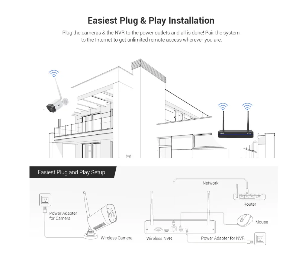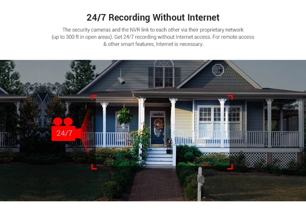 · Wi-Fi доступ, реальная система plug-and-play· Расширенный H.264 + сжатие видео· Мгновенное Обнаружение движения оповещение по электронной почте· Простое в использовании приложение для мобильного мониторинга· Истинная дневная и Ночная непрерывная защита· До 100 футов ночного видения с умным ИК· IP66 Водонепроницаемая камера для помещений и улицы Посылка включает в себя: Регистратор не входит в комплект, пожалуйста, покупайте отдельно! Ip-камера x2 или x4 1080P HDАдаптер питания x2 или x4