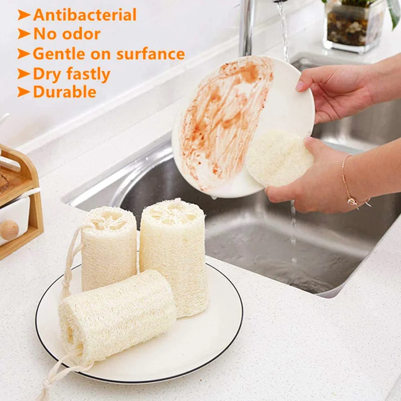 100% без пластика: Эти био-degradeable кухонные scrubbies луфа vegatable, растительные волокна поставляются с коричневой бумажной упаковкой делают их экологически безопасными, дышащими, устойчивыми, перерабатываемый заменяет все виды домашнего скраба из пластика. Сбрасывайте в компостную груду, когда они изношены.