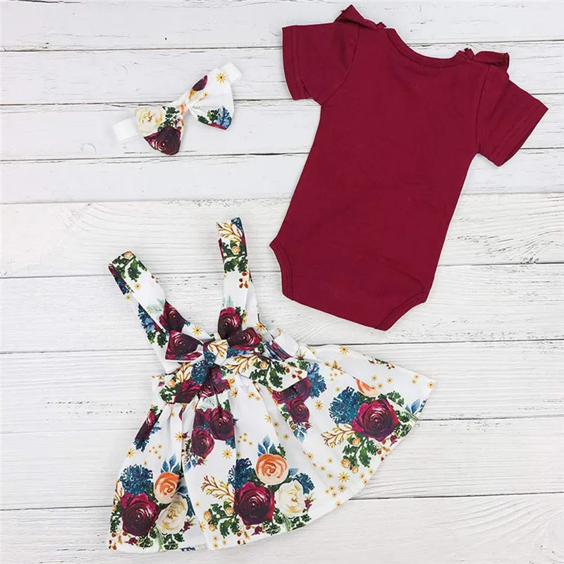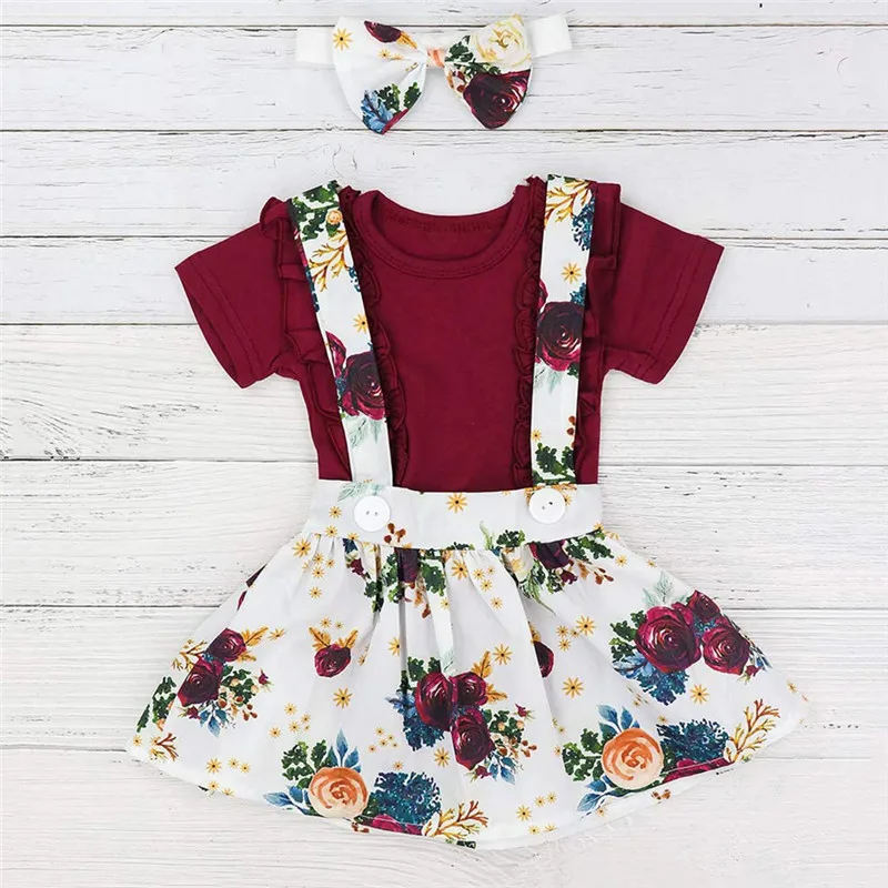 Одежда для маленьких девочек; Милый однотонный комбинезон с короткими рукавами для новорожденных; Топы; Юбка на бретелях с цветочным рисунком; Одежда для младенцев