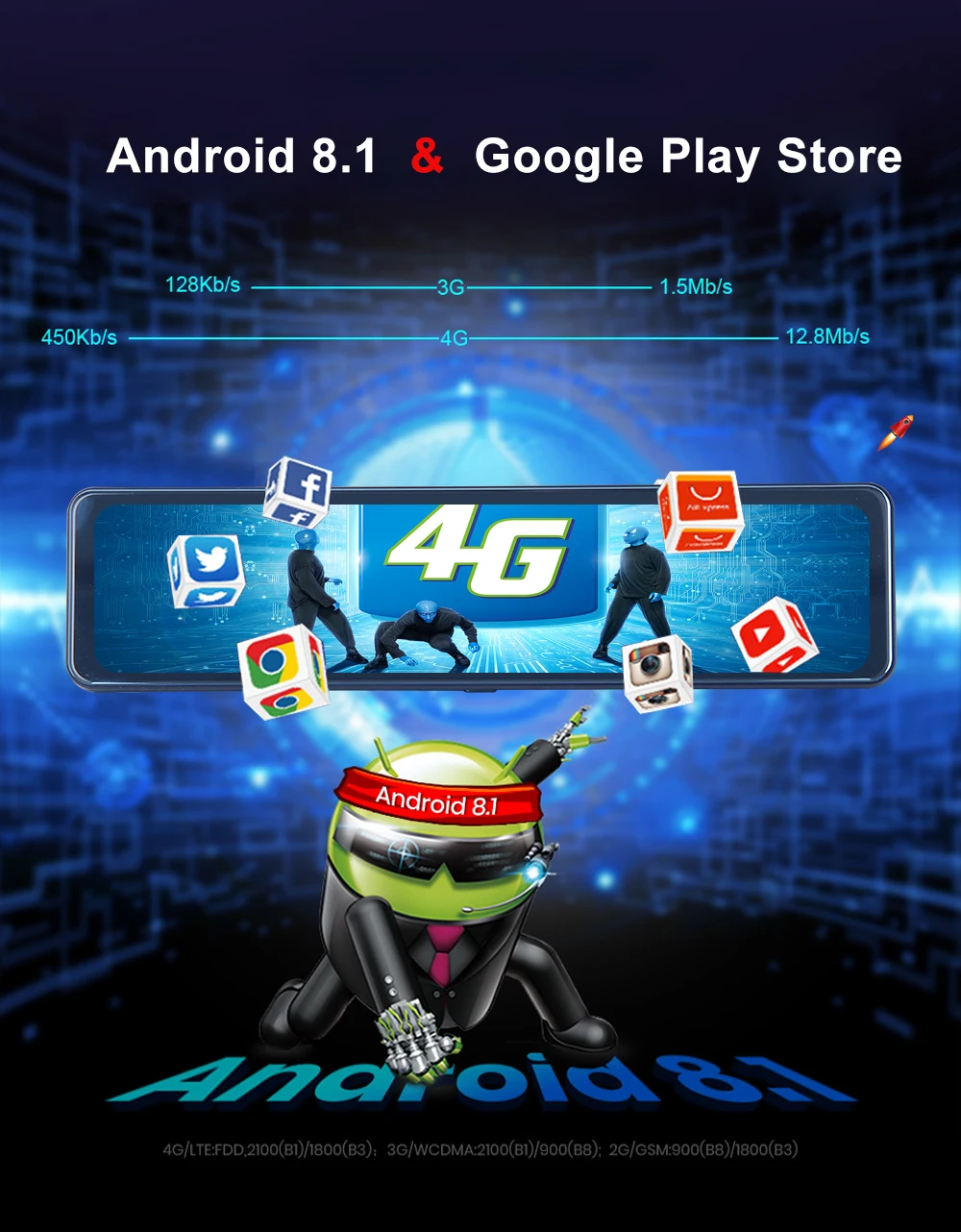 Четырехъядерный 1,4 ГГц высокопроизводительный процессор включает Android 8,1 интеллектуальных систем. Это делает Автомобильный видеорегистратор более быстрым. Вы можете скачать любое приложение из магазина google play.