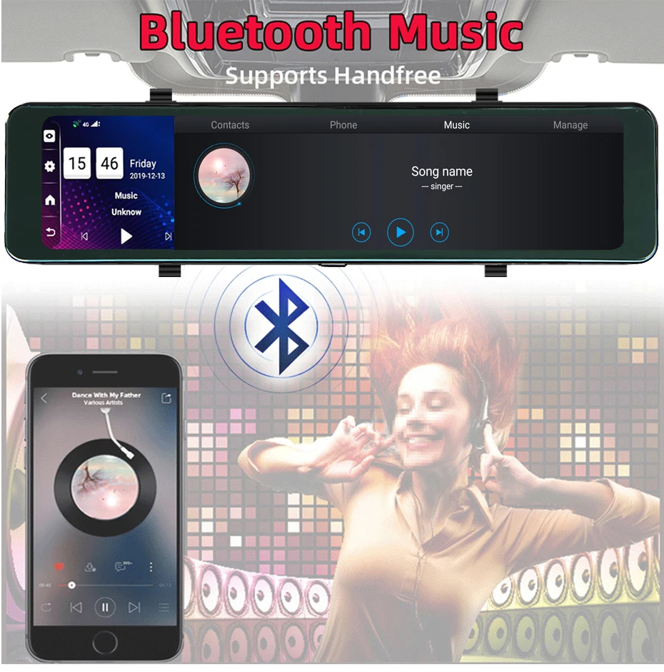 Он встроен в модуль bluetooth, После сопряжения bluetooth с мобильный телефон, он может поддерживать телефонный звонок на автомобильном зеркале dvr, или передавать музыкальные песни на Автомобильный видеорегистратор с мобильного телефона.