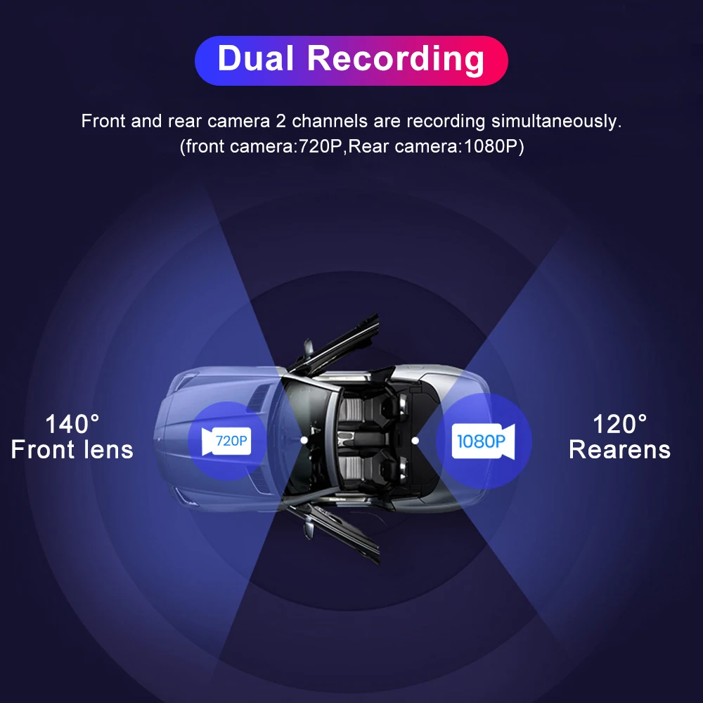 Это устройство поставляется с двумя широкоугольными камерами и может использоваться для передней и задней частей вашего автомобиля. Две HD камеры могут одновременно записывать каждый мимолетный момент. Спереди 140 градусов; Сзади 120 градусов. Внимание: Сенсорный экран для переключения задней камеры. Он не может отображаться на одном экране одновременно.