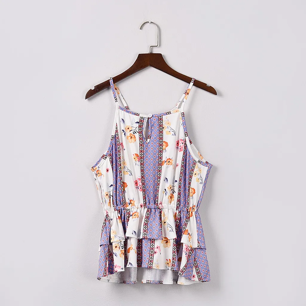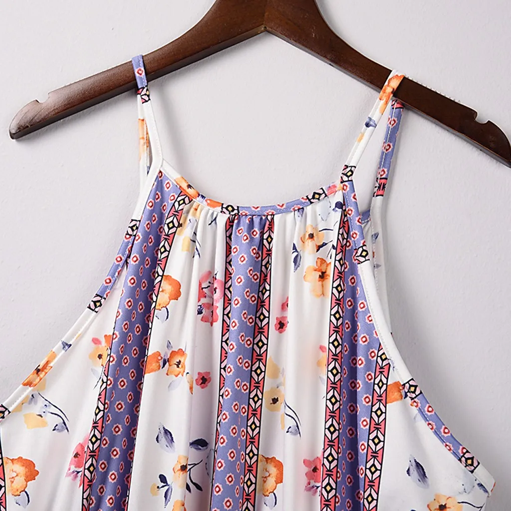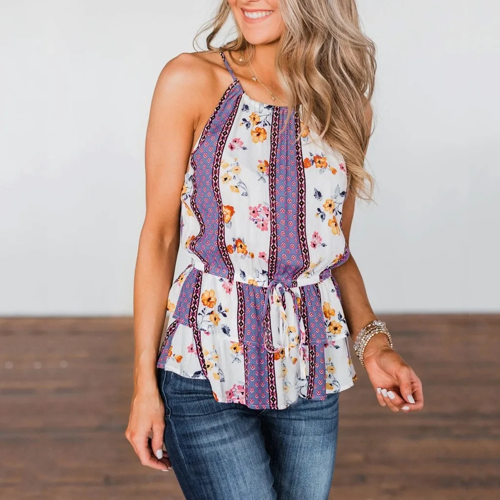 Летние женские лоскутные блузки без рукавов с цветочным принтом и круглым вырезом; Топы на бретелях