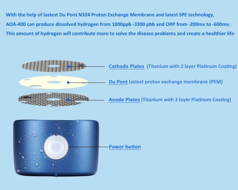 С помощью Du Pont N324 протонная мембрана для обмена и новейшие технологии SPE, AOA-400 может производить растворенный водород 1000ppb - 3300 ppb и ORP -200mv до-600mv в воде это количество водорода будет способствовать большему решению проблем болезни и созданию более здоровой жизни. Свободные радикалы вызывают множество здоровых проблем: В организме свободные радикалы вызывают аналогичное ухудшение, так как они разрушают клеточные мембраны и делают клетки уязвимыми для распада и патогенов. Эти свободные радикалы повреждают DNA и митохондрии, Основные строительные блоки всех тканей и оставляют на своем пути множество проблем со здоровьем. Водород удаляет свободные радикалы: Растворенные молекулы водорода ищут самые вредные свободные радикалы в наших телах и нейтрализует их, прежде чем они могут сделать больше повреждений наших клеток. H2 дарит электрон и связи со свободным радикалом для создания молекулы, в которой наши тела нуждаются в H20 или воде. Преимущества для питья водорода богатой водой: Согласно 500 научным исследованиям с 2007 года, было обнаружено, что молекулярный водород имеет большой терапевтический потенциал для лечения более 150 заболеваний. Попав в наш организм, он мгновенно начинает восстанавливать ткани и органы на клеточном уровне. Основные преимущества для здоровья: • Удалите вредные свободные радикалы из вашего организма • Улучшение здоровья и защиты клеток • Улучшает поглощение питательных веществ в организме • Лучшее увлажнение для вашего тела • Увеличение кровообращение • Помогает снизить уровень насыщенного жира • Уменьшает старение, чтобы придать коже здоровый вид • Улучшает функции мышечной ткани и подвижность суставов • Уменьшить запор проблемы • Помогает снизить уровень холестерина • Детоксикация вашего тела • Быстрое восстановление после физической тренировки • Улучшает качество жизни больных раком, проходящих медицинское лечение. AOA-400 имеет следующие преимущества продукта: 1: эстетический дизайн, красивый 2. Du Pont PEM мембрана с новейшей технологией SPE 3. Пластины электролиза изготовлены из титана с многослойным платиновым покрытием. 4. Высокое боросиликатное стекло. 5. Два режима работы, 5 минут и 10 минут 6: Режим самоочистки (также называется режимом озона), вода используется для очистки овощей для удаления пестицидов или дезинфекции. (вода из этого режима не может быть выпита) 7. Конструкция выхлопных газов, отсутствие озона, кислорода и перекиси водорода 8. Водород макс до 3300 ppb и ORP макс до-600мв (в зависимости от качества воды и сколько раз электролиза) 9. Используйте эксклюзивную технологию растворения водорода, удерживайте водород в воде 10. Нет ограничений по источнику воды, можно использовать даже дистиллированную воду и очищенную воду. 11. Оснащен простым набором для ингаляции водорода, легко вдыхать водород в любое время и в любом месте