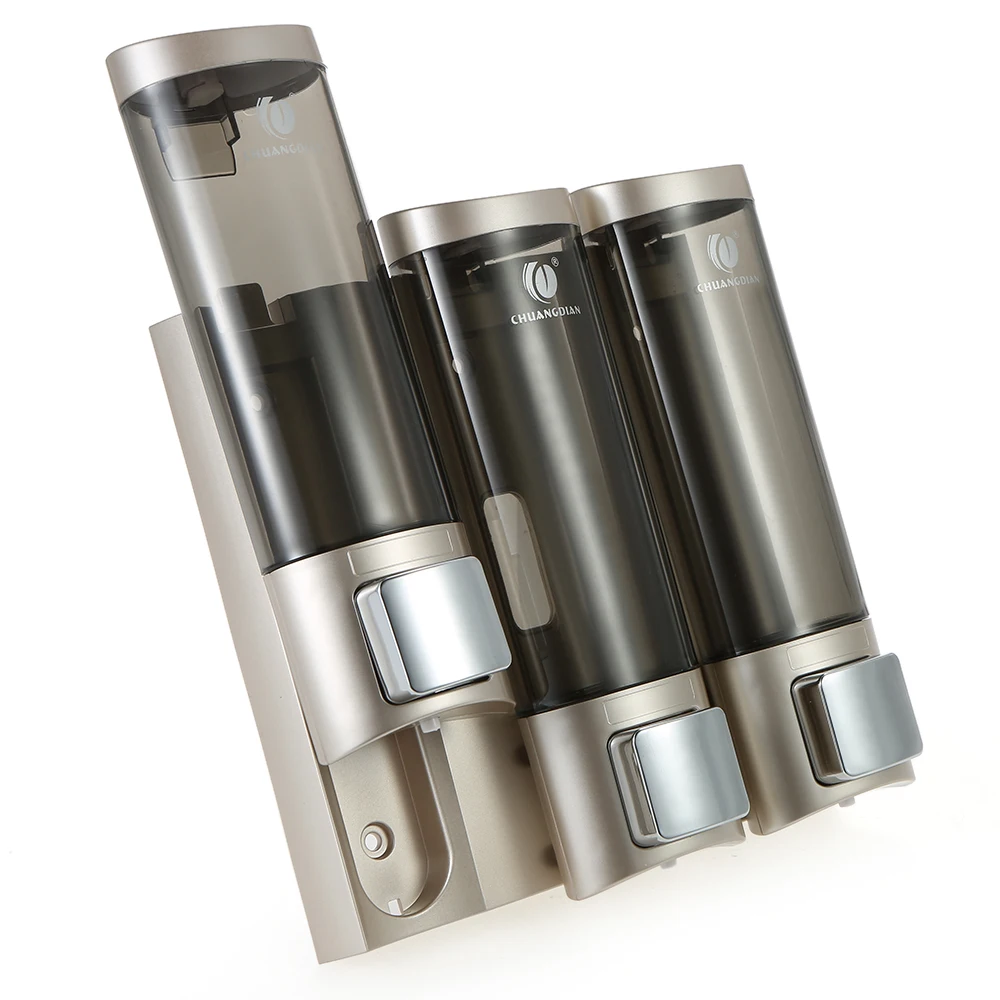 Три камеры для хранения жидкого мыла или дезинфицирующего средства, гель для душа, шампунь в одном блоке.