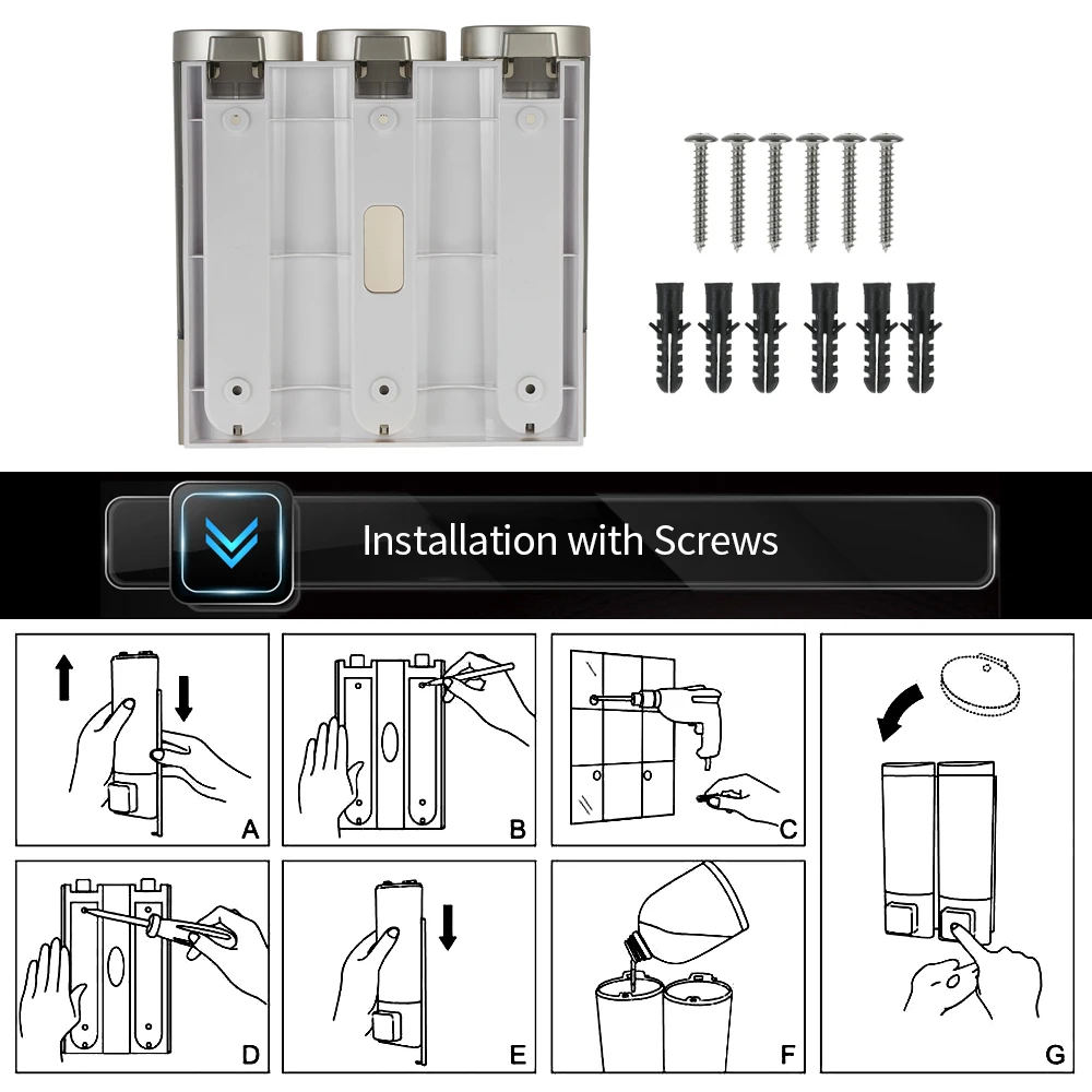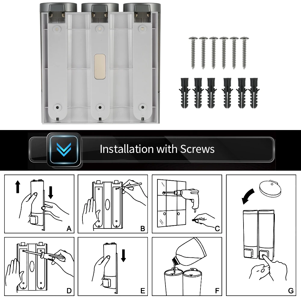 Оснащен двухсторонними пенными лентами и винтами без гвоздей для крепления дозатора на плиточную стену без какого-либо сверления на стену, или установите его на стену с помощью предоставленных винтов и шлангов.