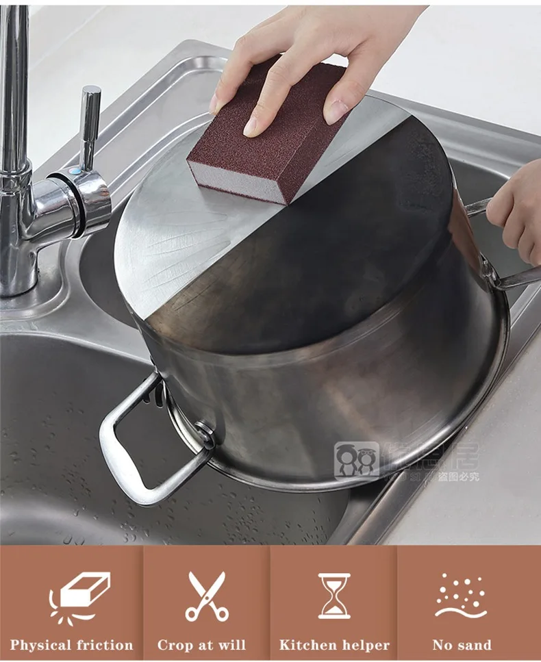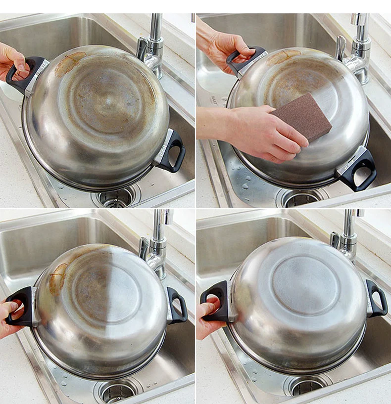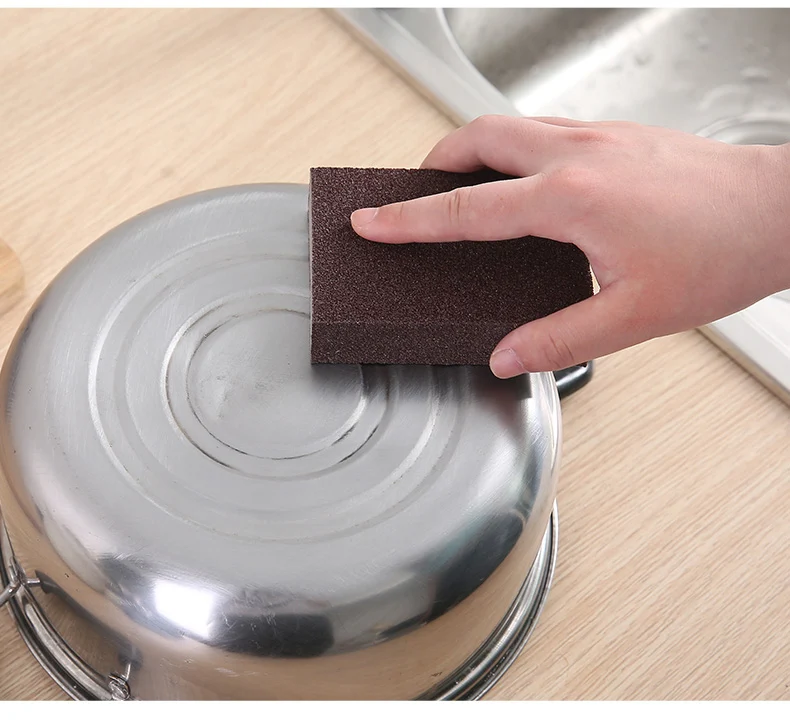 Особенности на 100% абсолютно новый и высококачественная простая в очистке кухонная утварь идеально подходят для чистки посуды, нержавеющей стали и т. д. это хороший помощник для вашей жизни Материал: Эмери и губка Размеры: 100x70x25 мм Цвет: темно-коричневый, как показано Упаковка: только 1 шт. губки