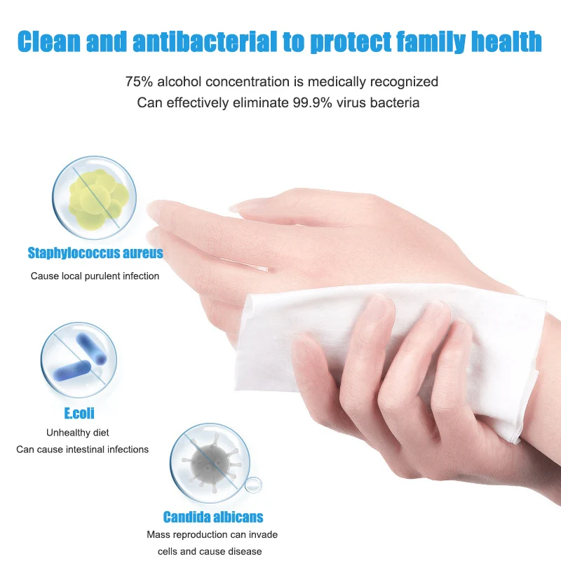 1. Натуральные разлагаемые материалы, безопасные и не раздражающие 2. Не содержит флуоресцентных веществ и консервантов 3. Хороший эффект стерилизации, легко носить с собой 4. Может использоваться для дезинфекции кожи, вокруг ран и перед инъекцией 5. Для очистки и дезинфекции клавиатуры, мобильных телефонов, офисных принадлежностей, предметов для переноски, посуды, детских игрушек и т. д. 6. Аварийная дезинфекция небольших ран, таких как открытый туризм, кемпинг, плавание и т. д.