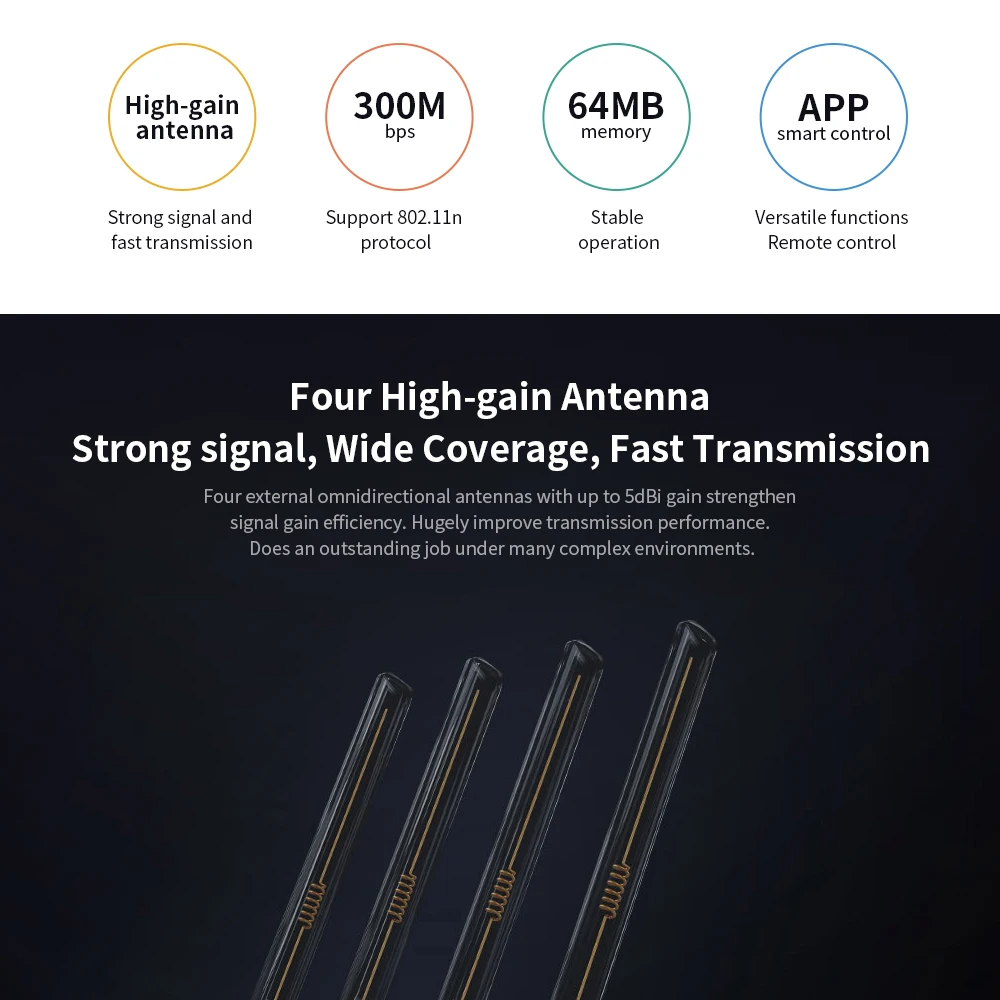 Четыре внешних всенаправленных антенны с коэффициентом усиления до 5dBi повышают эффективность усиления сигнала. Чрезвычайно повышает производительность передачи. Делает выдающуюся работу во многих сложных условиях.