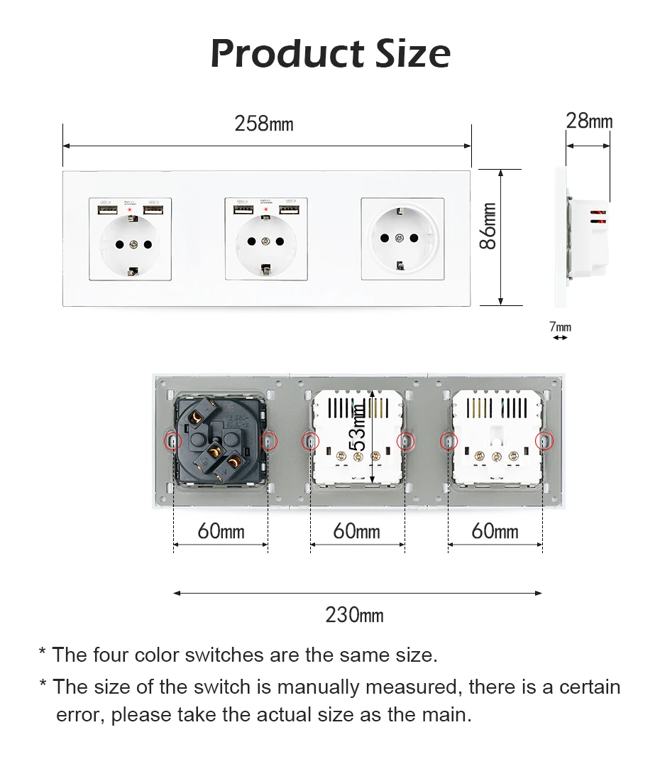 1. 100% новая и высококачественная панель розетки. 2. Этот продукт должен устанавливаться профессиональным электриком. 3. Он широко используется во многих местах, таких как гостиница, ресторан, дом, общественные места.