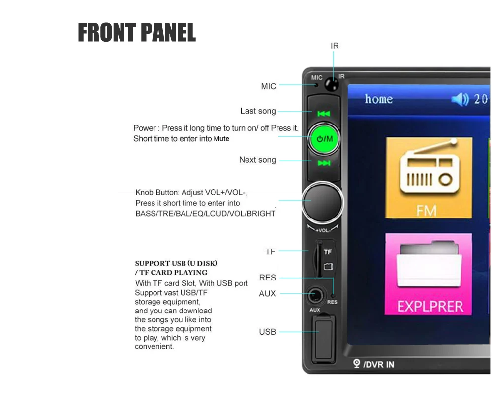 7-дюймовый HD сенсорный экран + Bluetooth + FM/MP5 + USB порт/TF слот для карты + вход Aux