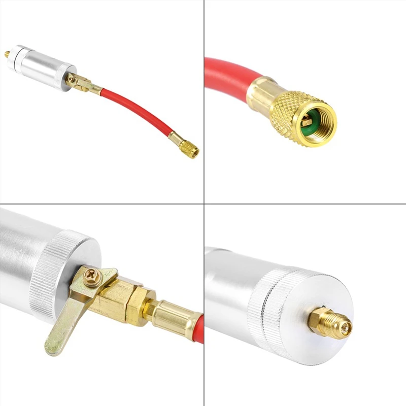 Прежде чем добавить в инжектор какую-либо добавку, запорный клапан должен быть выключен. Uscrew конец от инжектора. Положите в нужное количество добавки. Прикрутите конец назад к инжектору. Подключите муфту R134A R12 F22 к инжектору.