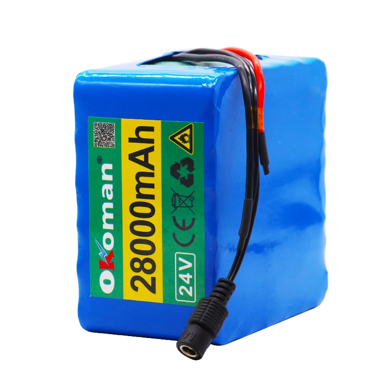Internal protection circuit: overload, over discharge, over current, short circuit protection Battery weight: about 1.5kg Packaging: Blue PVC Battery cells inside : Big brand 18650 cells . Good quality! Life Cycles : Over 1000 times Applications: Electric vehicles, model aircraft, electric tools, battery pack diy, Golf carts, sightseeing coaches, electric Motorcycles, Electric bicycles ,power wheelchairs And Others . [Battery discharge Spcs]: The maximum peak current: 36A Maximum operating current: 18A Packing included: 1.24V (25.2v) 28Ah Li-ion Battery pack with Built-in BMS board 2.25.2v charger (With EU/US AC Charger plug you can choose, if there is no special instructions, we will send the EU plug by default)