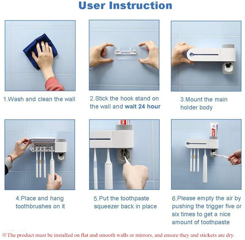 1. Несколько стеллажей для хранения: держатель зубной пасты, УФ стерилизатор зубных щеток, 5 независимых органайзер для зубной щетки (включая головки электрической зубной щетки). Храните зубную пасту, чистите и сушите. 2. УФ стерилизатор: УФ-стерилизатор убивает 99.9% бактерий и микробов, уф стерилизация продолжалась 4 минуты (закройте крышку при работе), вы можете использовать безопасную, свежую, зубная щетка для чистки каждый раз, вместо мокрого, вызывающего чувство. 3. Многофункциональный дизайн: Держатель УФ-зубной щетки не только подходит для семейного использования, но также может использоваться в качестве медицинского устройства. Это может уменьшить размножение бактерий; УФ-светильник убивает агрессивные микробы и предотвращает размножение микробов после стерилизации. 4. Простота установки: Нет дрелей. Можно просунуть Зубная щётка держатель на чистую Стекло/Керамика плитки (гладкая поверхность) с 3M клейкой ленты.