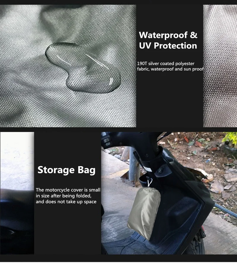 1. Водонепроницаемость и защита от солнечных лучей:Чехол для мотоцикла изготовлен из 190T полиэстера, защищен от дождя, пыли и ультрафиолета; Защитит ваш мотоцикл от дождя, ржавчины, выцветания, старения, мороза и многого другого.