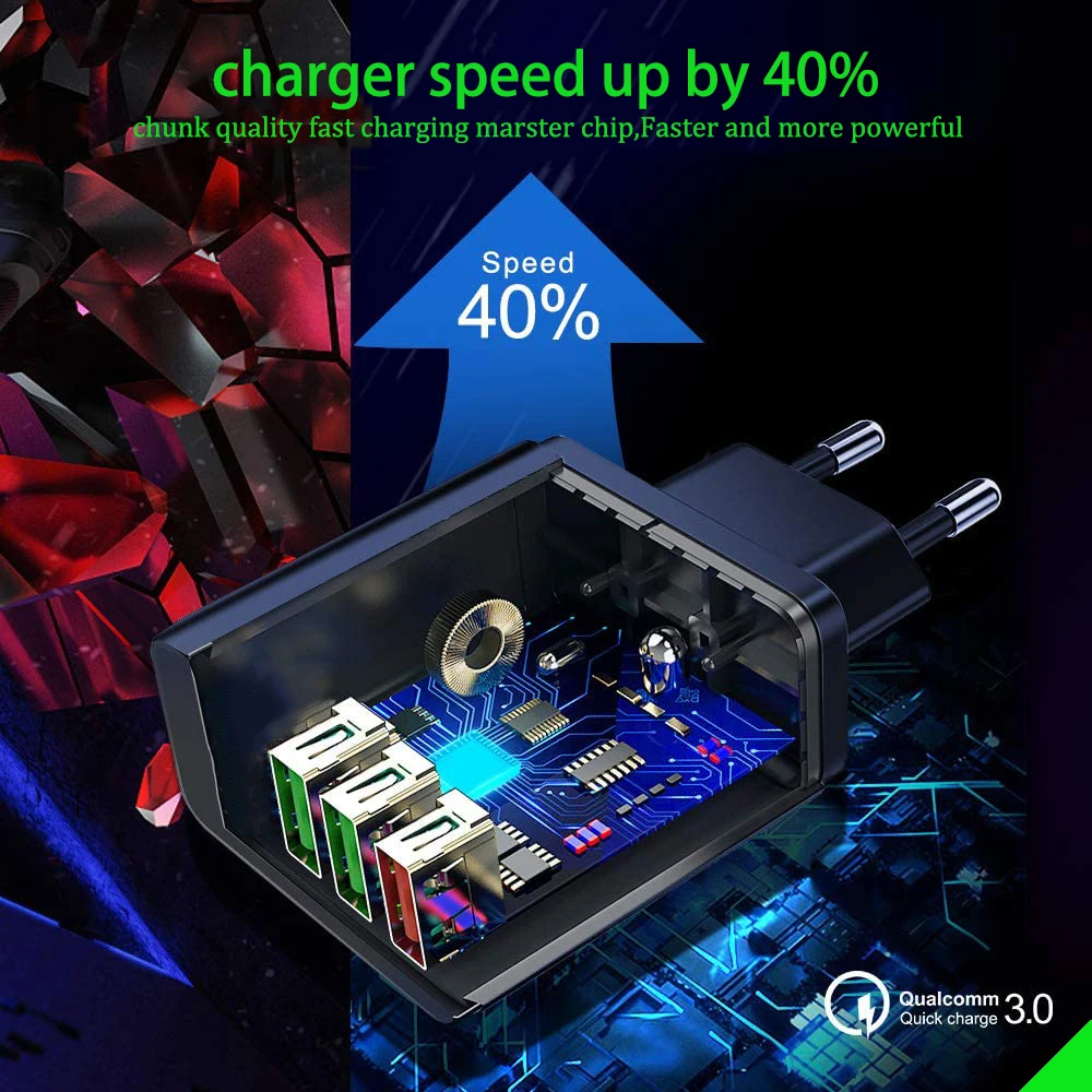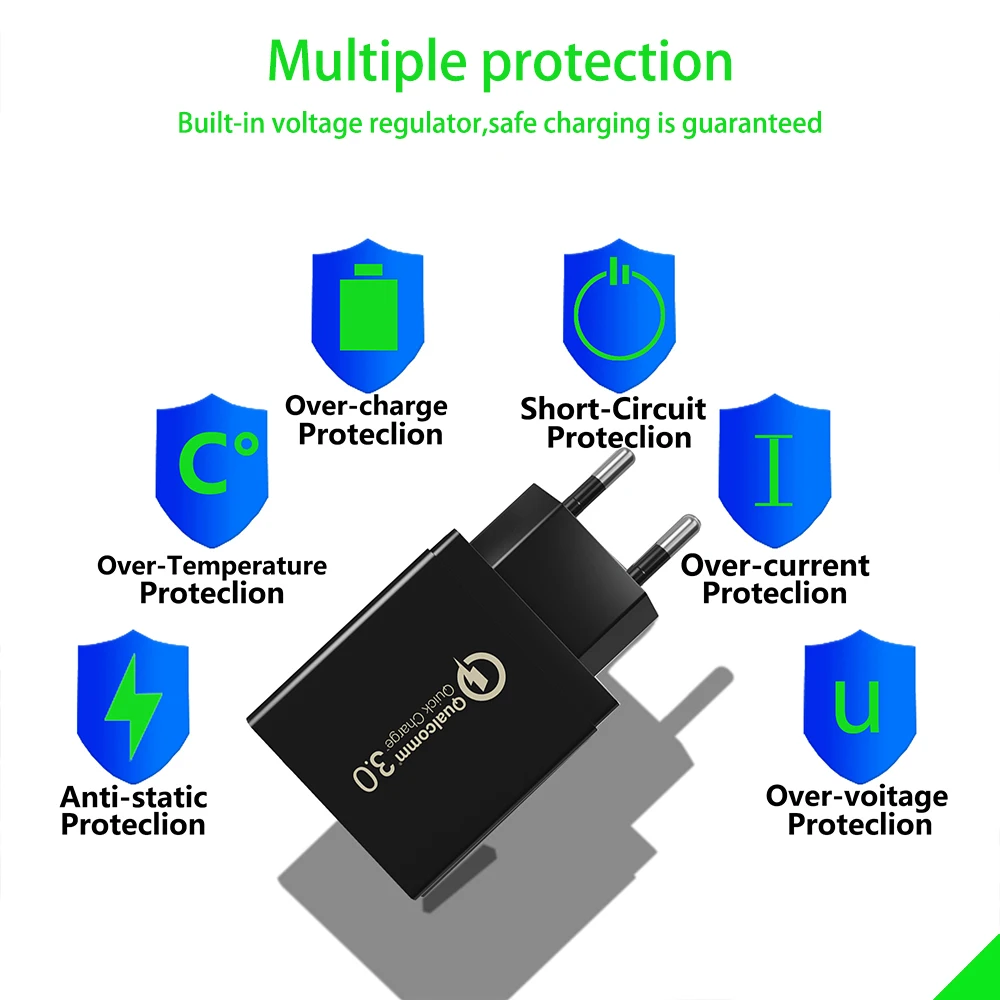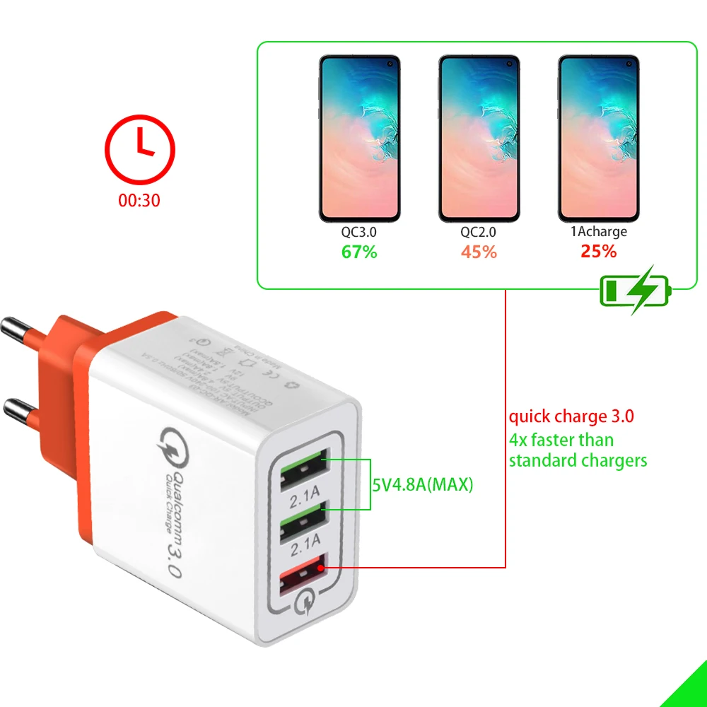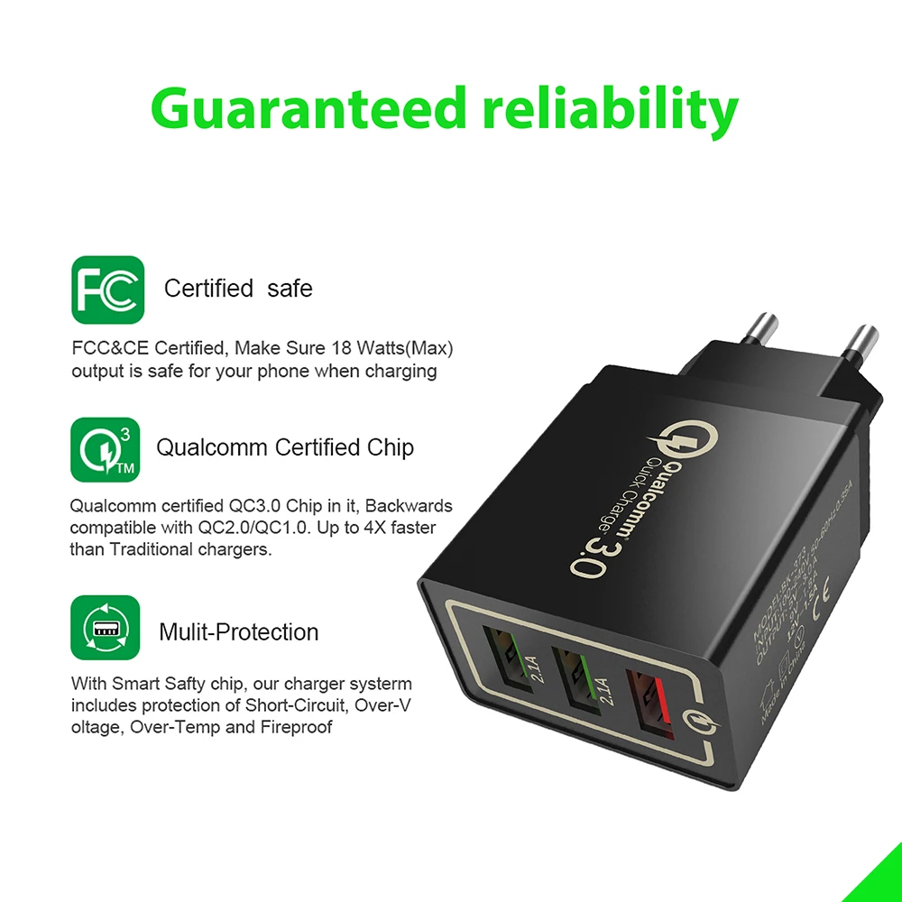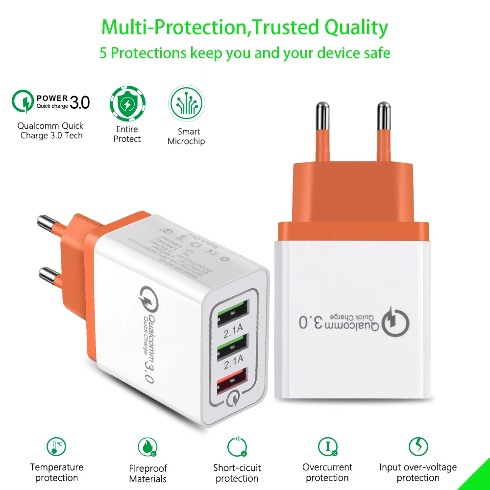 Особенности: 1. Портативное зарядное устройство для дома, в офисе, в путешествиях и другие внутреннего использования. 2. С 3 портами (стандарт портов (зарядное устройство с функцией быстрой зарядки 3,0 и зарядное устройство с 2 USB портами 5V/2,1 а (макс.), одновременную зарядку 3 устройств в одно и то же время. 3. Защита защищает вас и ваши устройства. 4. Совместим со всеми смартфонами, как для iPhone, iPad, Samsung, Xiaomi, OPPO OnePlus Sony Google и tablet PC Camera MP3 MP4 плеер PSP с USB портом для зарядки. 5. Умный соответствующий ток. Встроенный интеллектуальный чип, в соответствии с различными устройствами, соответствующий требуемому выходу, быстрая зарядка и не повреждает аккумулятор.