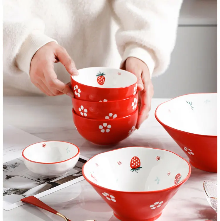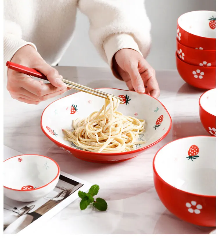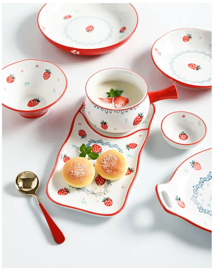 Керамическая тарелка с красной клубничкой, фарфоровый десертный стейк, закуска, рисовый суп, большая миска, столовая посуда, ложка, креативный набор