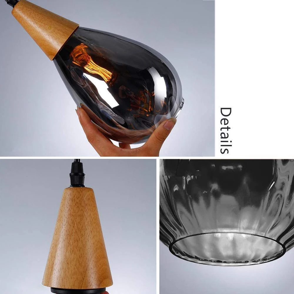 Тип: подвесной светильник из дерева и стекла Материал: стеклянный абажур, ПВХ, дерево Светильник источник: E27 лампы (не прилагаются) Подвесной светильник Длина кабеля: 1,2 м (регулируемая) Источник питания: AC90-260V Размер: диаметр 16 см, высота: 30 см