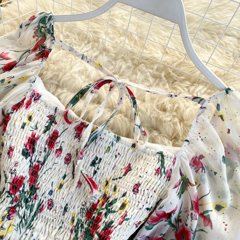 Женские блузки и топы во французском стиле с цветочным принтом, привлекательная дизайнерская блузка из эластичного шифона с квадратным вырезом, топ с завязками сзади, с асимметричным подолом с оборками