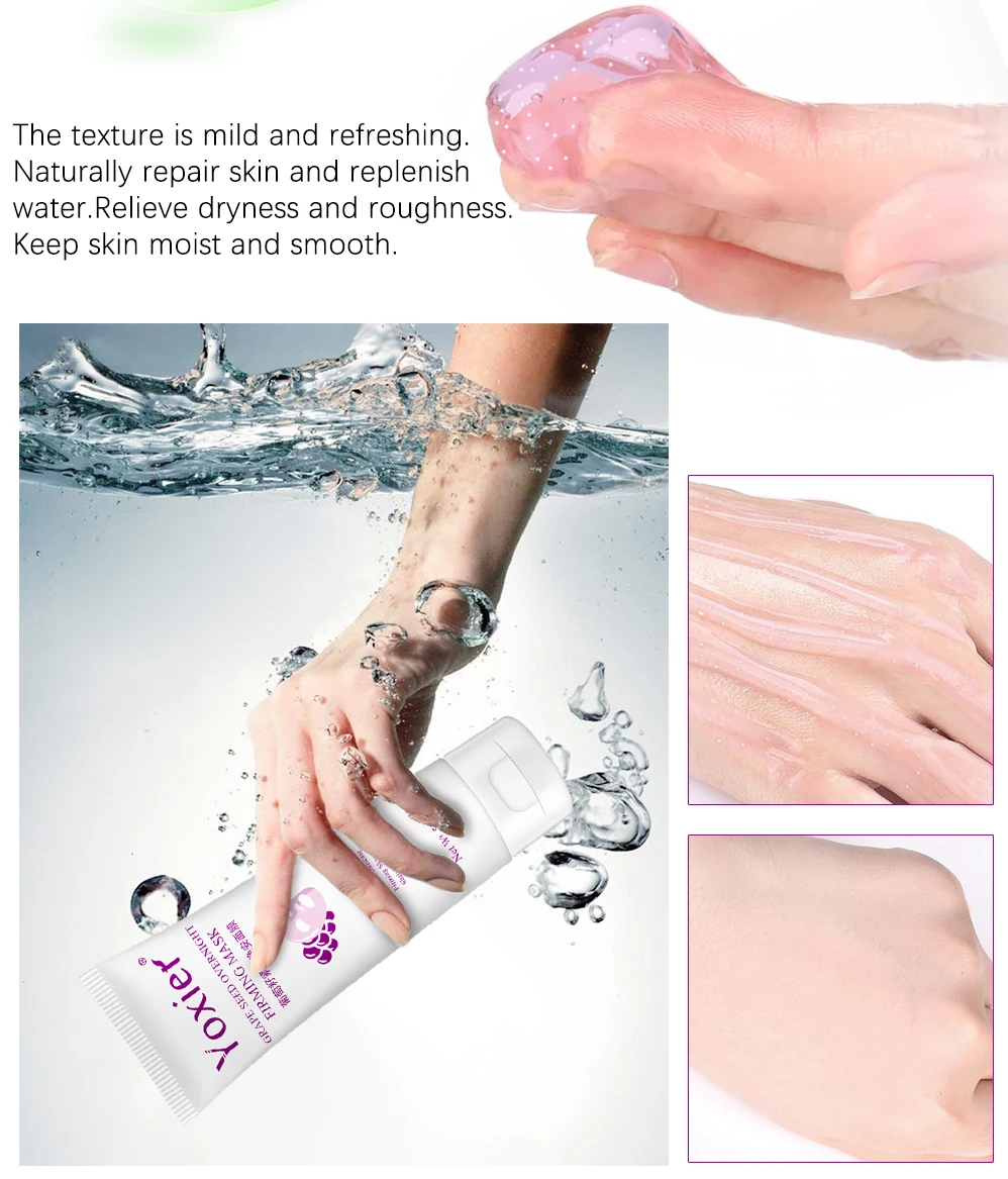 Содержит мелкие частицы, содержит много энергии Экстракта Виноградных косточек, может блокировать ультрафиолетовые лучи от проникновения на кожу, уменьшает появление морщин кожи, сохраняет кожу мягкой и гладкой, И оказывает очевидное влияние на лечение акне, пигментации и отбеливания.