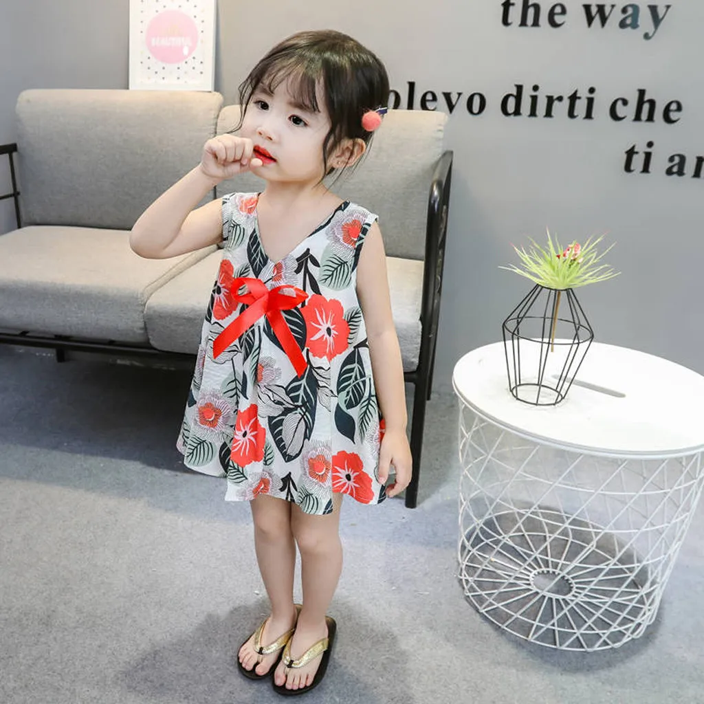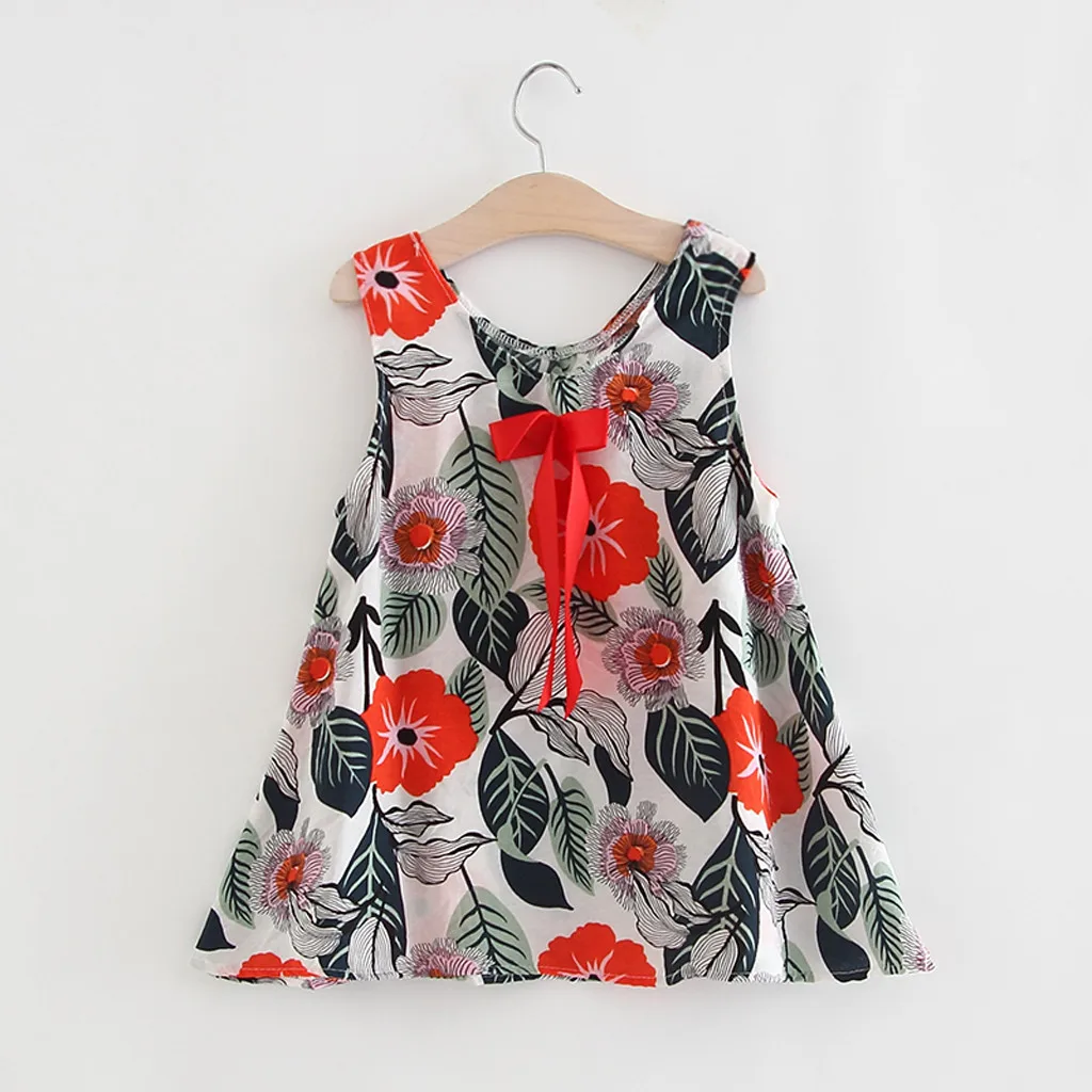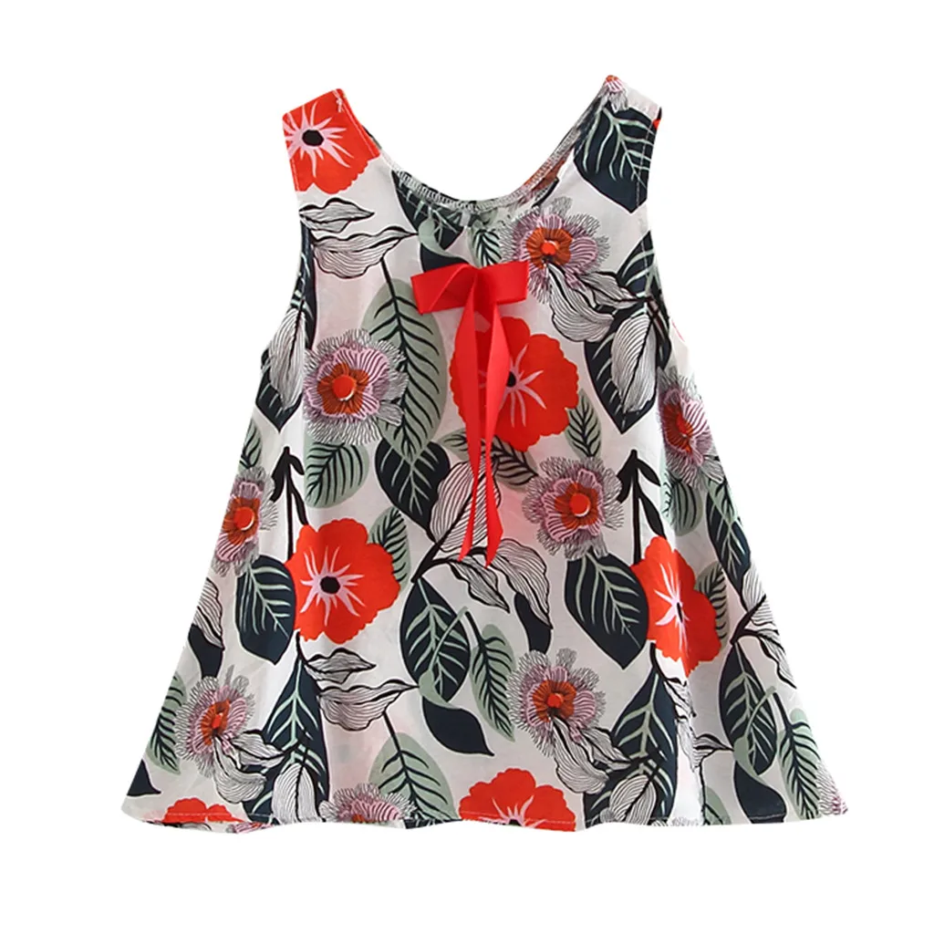 Популярное летнее платье для девочек платья без рукавов с цветочным принтом и бантом для маленьких девочек Одежда для девочек t3