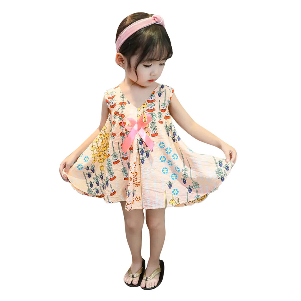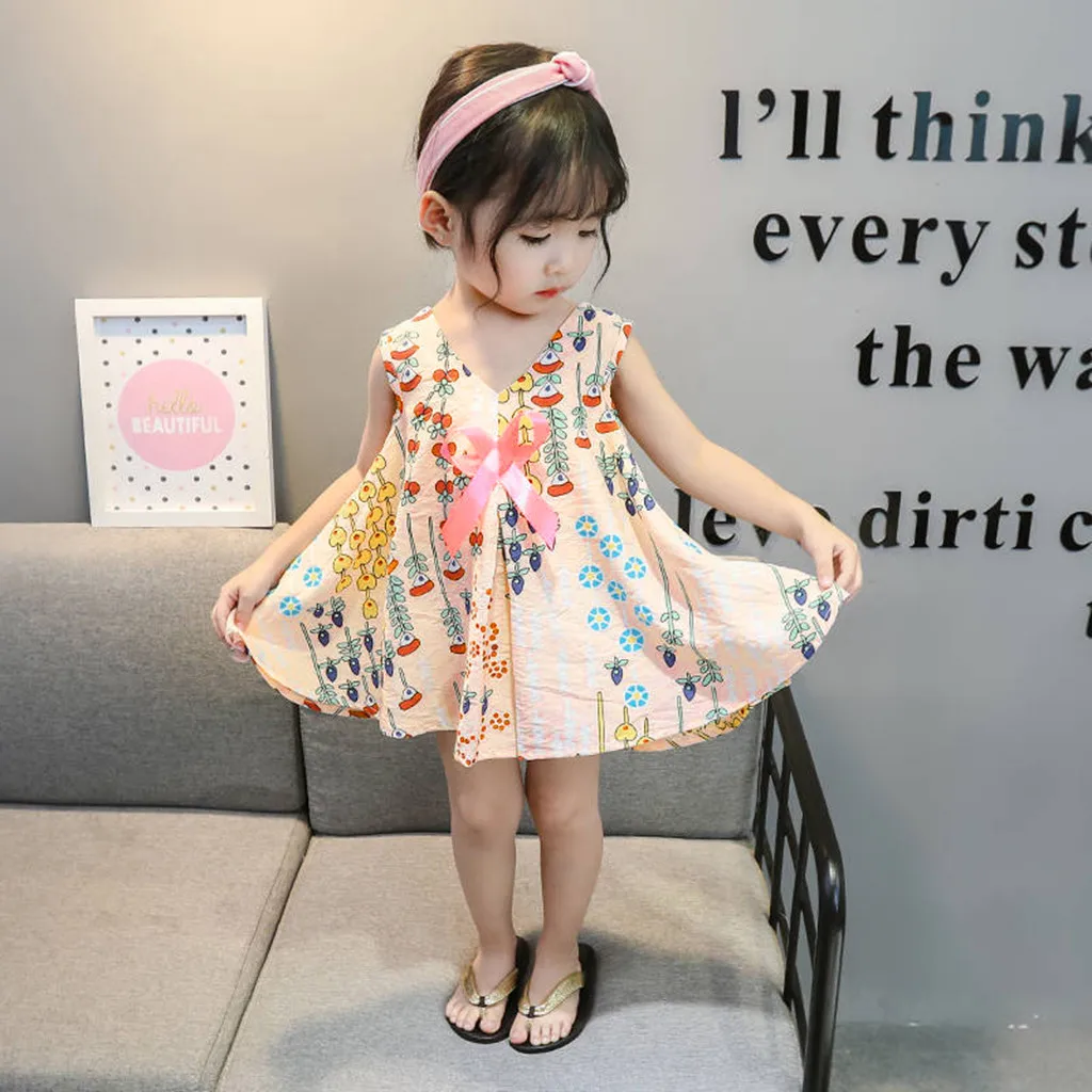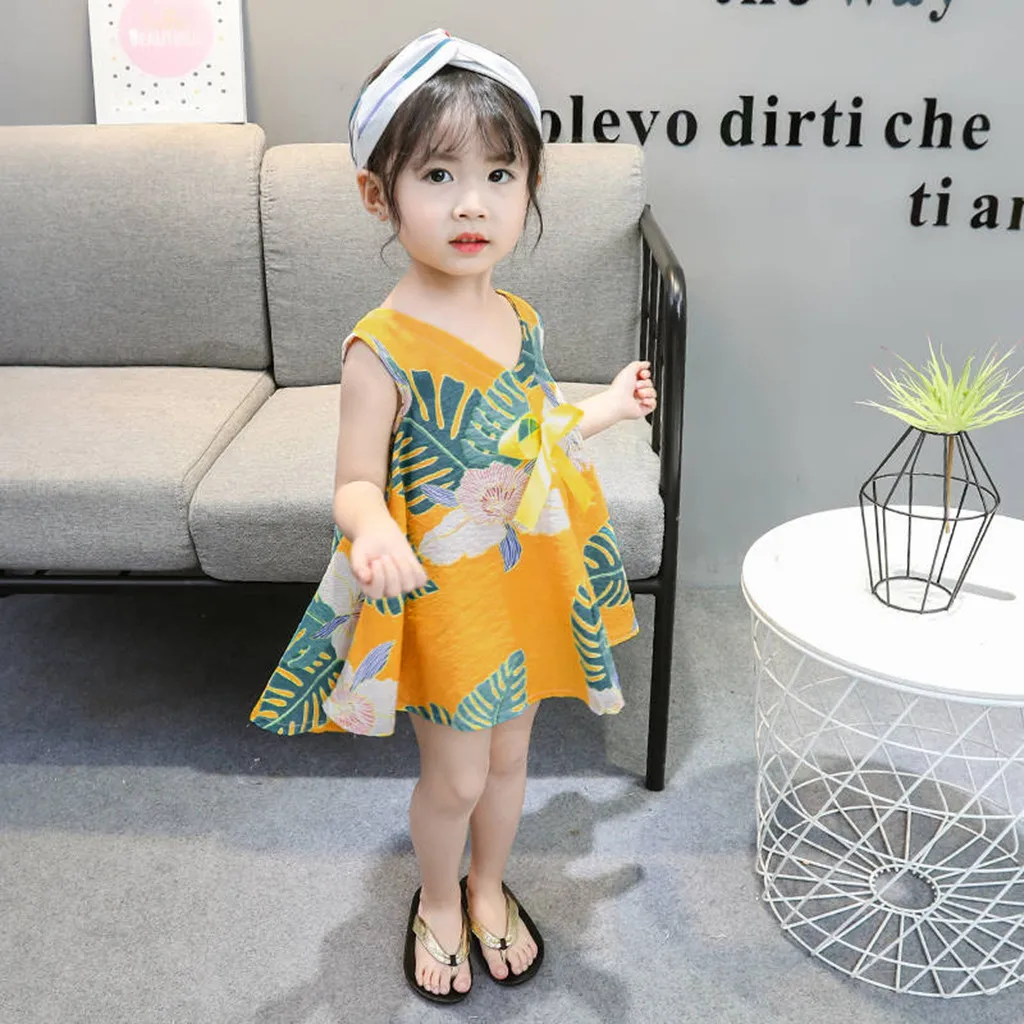 Популярное летнее платье для девочек платья без рукавов с цветочным принтом и бантом для маленьких девочек Одежда для девочек t3