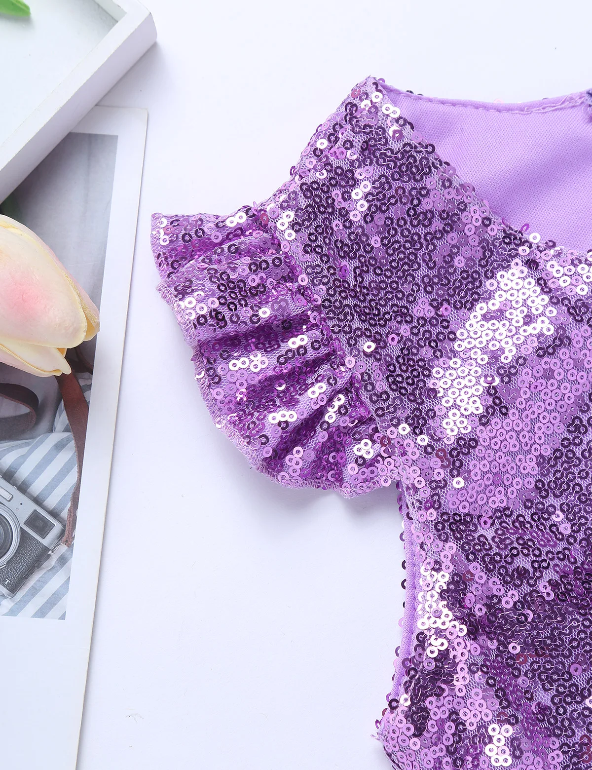 Короткие рукава с оборками, круглый вырез. Все украшено блестящими блестками. Гофрированный подол.