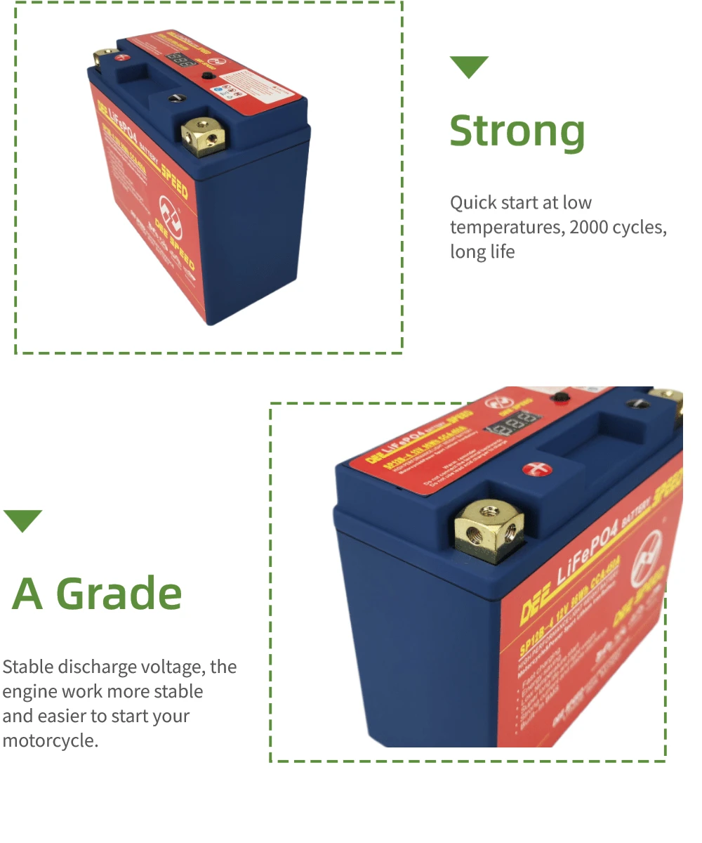 1. Пожалуйста, сообщите нам, какой бренд и модель вашего мотоцикла, мы порекомендуем подходящие модели для вас. 2. Перед установкой и использованием убедитесь, что вся электрическая система мотоцикла является нормальной (Е. g. Выпрямитель, Магнето и есть ли утечка электричества) и избегайте доставки в оба конца, вызванной возвратом товаров, кроме батареи, перед проблемами качества. 3. Пожалуйста, проверьте положительное и отрицательное направление оригинальной батареи перед покупкой, чтобы избежать ситуации, которая не может быть установлена после покупки. 4. Стандарты измерения свинцово-кислотных батарей и батарей lifepo4 отличаются, можно рассматривать как количество liftpo4, разделенное на два, что эквивалентно емкости свинцово-кислотных батарей. (Например, 4.5AH для батареи lifepo4 эквивалентен 9AH для свинцово-кислотной батареи, но пусковой ток такой же, как для свинцово-кислотных 9AH). 5. Если мотоцикл оснащен другими электрическими приборами, потребление электроэнергии будет зависеть, особенно GPS и сигнализация, что значительно повлияет на состояние ожидания литиевой батареи. Все знают, что литиевые батареи могут взорваться, но вам действительно сложно взрывать литиевые железные фосфатные батареи. Вот некоторые знания о литиевых железных фосфатных батареях. Что такое LiFePO4 аккумулятор? Литий-железо-фосфат (LiFePO4) батарея, также называемая LFP батарея (с "LFP" стоя для "литий-феррофосфат"), является типом перезаряжаемой батареи, в частности литий-ионный аккумулятор, который использует LiFePO4 как катодный материал. LiFePO4 батареи имеют несколько более низкую плотность энергии, чем более распространенный литиевый оксид кобальта (LiCoO2) дизайн, используемый в бытовой электронике, но обеспечивают более длительный срок службы, лучшую плотность энергии (скорость, которую энергия может быть получена от них) И по своей природе безопаснее. LiFePO4 ищет ряд функций в использовании автомобиля и резервного питания.