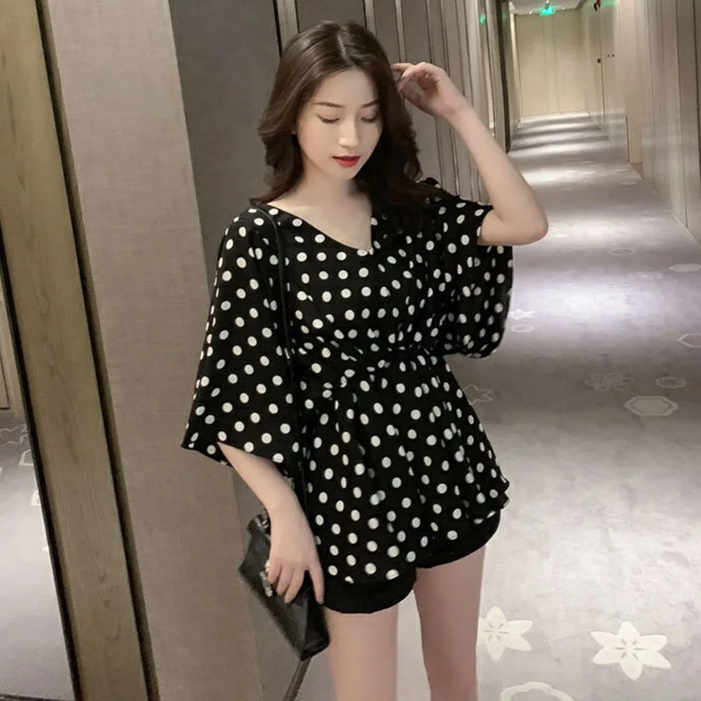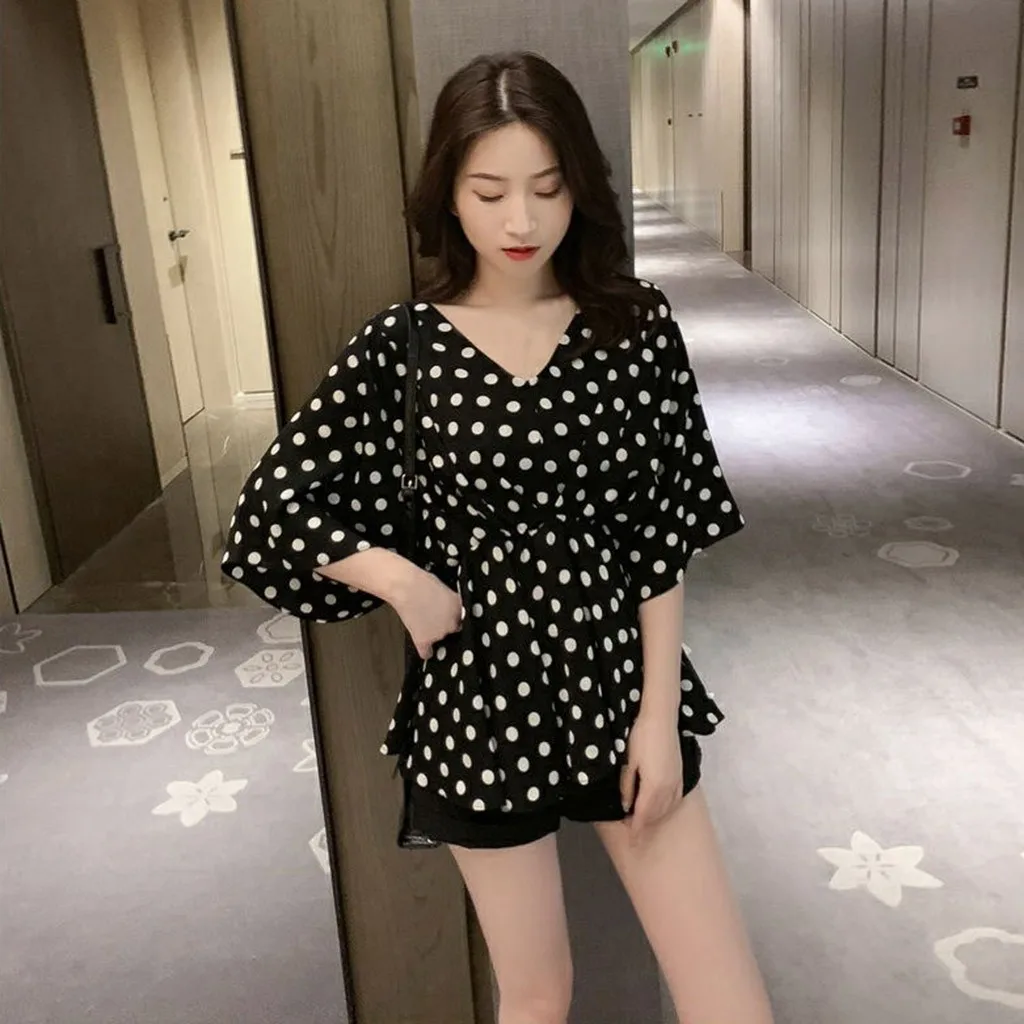 Женская милая стильная блузка в горошек с коротким рукавом, летняя рубашка