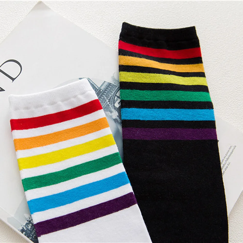 1 пара, Гольфы выше колена в радужную полоску для девочек, футбольные спортивные носки, черные, белые