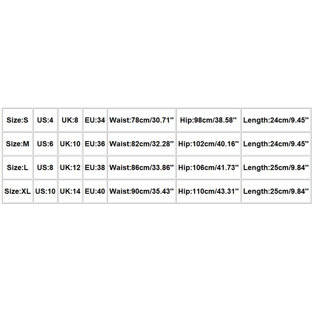 SizeUSUKEUWaistHipLengthS483478cm/30.71''98cm/38.58''24cm/9.45''M6103682cm/32.28''102cm/40.16''24cm/9.45''L8123886cm/33.86''106cm/41.73''25cm/9.84''XL10144090cm/35.43''110cm/43.31''25cm/9.84''