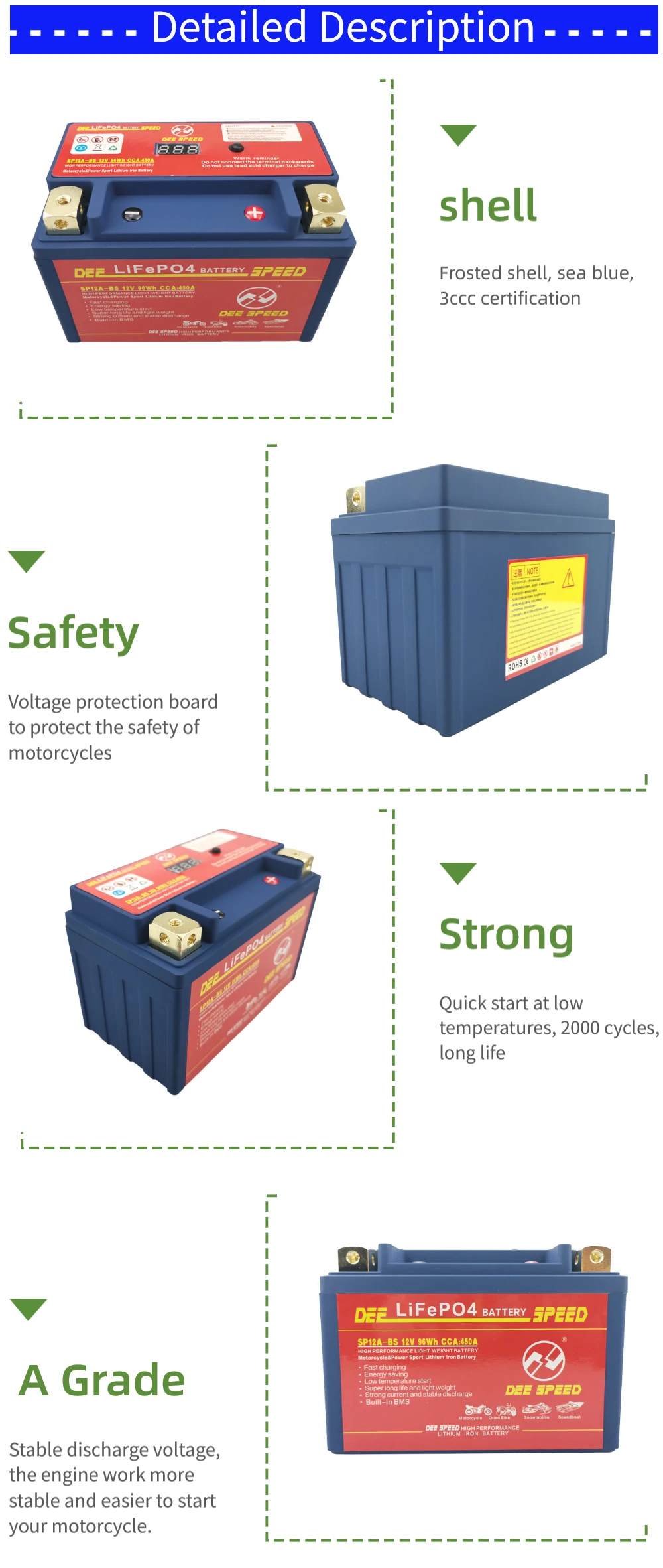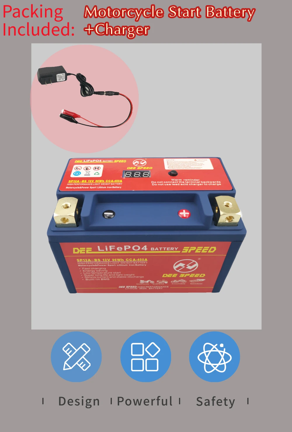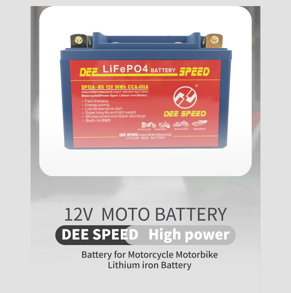 Преимущества: он имеет отличную безопасность и высокую эффективность и стабильность производительности, чем традиционные свинцово-кислотные батареи Светильник вес: это только в том случае, 1/3 раз светильник er, чем свинцово-кислотных аккумуляторных батарей. Низкий уровень саморазряда: он может храниться более 1 года (и нормальная свинцовая кислота может храниться только менее 6 месяцев). Отсутствие загрязнения: он не содержит каких-либо опасных материалов, таких как тяжелые металлы, кислоты или любые провода и т. Д. Отличная большая производительность зарядки: он может принимать ток зарядки 10C и 90% будет заряжаться за 6 минут. Экономия топлива: увеличение входного напряжения, повышение эффективности свечей зажигания, что позволяет экономить топливо для ваших автомобилей Длительный срок службы: как правило, срок службы нашей батареи может достигать более 2000 раз с емкостью 80% (свинцово-кислотная батарея noral имеет срок службы всего в 300 раз). Внимание: перед установкой проверьте правильность выпрямителя. Литиево-ионный аккумулятор для мотоцикла имеет следующие преимущества: 1) светильник вес, запуска для традиционных свинцово-кислотная батарея Вес около одной трети; 2) Экологическая защита, отсутствие серной кислоты, тяжелых металлов, таких как свинец, кадмий и ртутное загрязнение; 3) не нужно добавлять кислоту, полностью бесплатное обслуживание, отсутствие проблемы с утечкой кислоты, может быть установлен в любом направлении для использования, безопасный и надежный; 4) Высокая мощность, пусковой ток составляет более 40 с (отношение начала свинцово-кислотного пуска 10 с); 5) ЗАРЯДНАЯ способность сильна, может быть большой ток быстрой зарядки, самый быстрый может зарядить аккумулятор 10 с, 6 минут можно зарядить до 90% емкости. Даже после потери электричества, можно заполнить в течение короткого времени. 6) сверхдлительный срок службы, может быть больше 2000 раз (свинцово-кислотная батарея обычно 300); 7) Низкий саморазряд, длительное время хранения и может быть более 1 года. 8) стабильное напряжение разряда, двигатель работает более стабильно и проще, чтобы начать ваш мотоцикл.