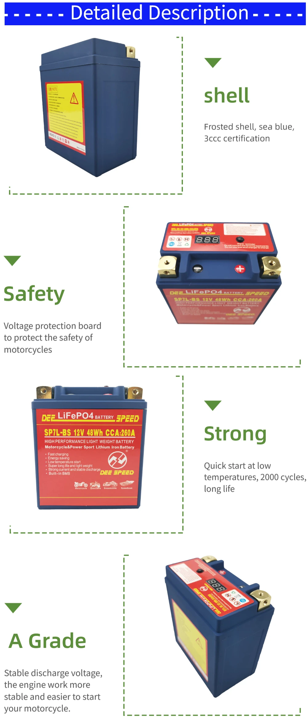 Преимущества: он имеет отличную безопасность и высокую эффективность и стабильность производительности, чем традиционные свинцово-кислотные батареи Светильник вес: это только в том случае, 1/3 раз светильник er, чем свинцово-кислотных аккумуляторных батарей. Низкий уровень саморазряда: он может храниться более 1 года (и нормальная свинцовая кислота может храниться только менее 6 месяцев). Отсутствие загрязнения: он не содержит каких-либо опасных материалов, таких как тяжелые металлы, кислоты или любые провода и т. Д. Отличная большая производительность зарядки: он может принимать ток зарядки 10C и 90% будет заряжаться за 6 минут. Экономия топлива: увеличение входного напряжения, повышение эффективности свечей зажигания, что позволяет экономить топливо для ваших автомобилей Длительный срок службы: как правило, срок службы нашей батареи может достигать более 2000 раз с емкостью 80% (свинцово-кислотная батарея noral имеет срок службы всего в 300 раз). Внимание: перед установкой проверьте правильность выпрямителя. Литиево-ионный аккумулятор для мотоцикла имеет следующие преимущества: 1) светильник вес, запуска для традиционных свинцово-кислотная батарея Вес около одной трети; 2) Экологическая защита, отсутствие серной кислоты, тяжелых металлов, таких как свинец, кадмий и ртутное загрязнение; 3) не нужно добавлять кислоту, полностью бесплатное обслуживание, отсутствие проблемы с утечкой кислоты, может быть установлен в любом направлении для использования, безопасный и надежный; 4) Высокая мощность, пусковой ток составляет более 40 с (отношение начала свинцово-кислотного пуска 10 с); 5) ЗАРЯДНАЯ способность сильна, может быть большой ток быстрой зарядки, самый быстрый может зарядить аккумулятор 10 с, 6 минут можно зарядить до 90% емкости. Даже после потери электричества, можно заполнить в течение короткого времени. 6) сверхдлительный срок службы, может быть больше 2000 раз (свинцово-кислотная батарея обычно 300); 7) Низкий саморазряд, длительное время хранения и может быть более 1 года. 8) стабильное напряжение разряда, двигатель работает более стабильно и проще, чтобы начать ваш мотоцикл.