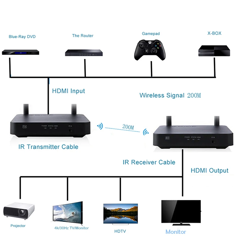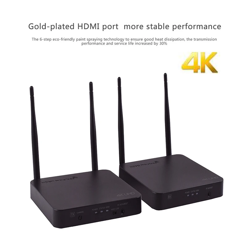 Этот беспроводной HDMI расширитель позволит пользователю передавать HD контент по беспроводной связи. Источники HDMI по беспроводному комплекту расширяют видео высокой четкости и аудио на любые HDTV дисплеи до 200 метров. Расширитель соответствует стандарту TCP / IP беспроводному транспортному протоколу, поэтому он имеет высокую скорость передачи и сильную возможность защиты от помех. Он также поддерживает hdmi-выход зеркала и расширение инфракрасного пульта дистанционного управления. Беспроводной удлинитель HDMI широко применим для офисной презентации, лекции, образования, конференции, семейных развлечений и т. д.