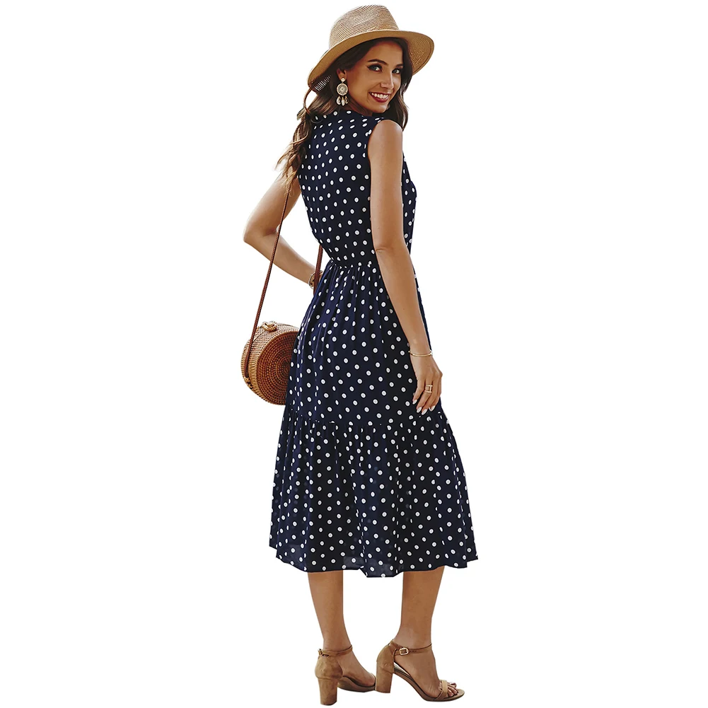 Женское стильное облегающее платье миди без рукавов с v-образным вырезом и принтом в горошек