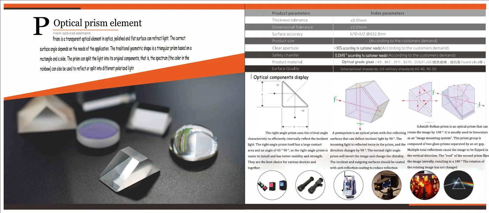 Beamsplitters, расходящиеся линзы, отражающие линзы, лазерные фокусирующие линзы, лазерные отражающие линзы, лазерные выходные линзы, селенидные линзы цинка, фторидные линзы кальция и УФ-плавленые линзы кремнезема, такие как beamsplitters, куб beamsplitters и другие beamsplitters, призмы, такие как правые призмы, пятиугольные призмы, пирамидальные призмы, призмы в форме голубя, Светоотражающие призмы, дисперсионные призмы, анаморфные призмы, покрытия, решетки beamsplitters, многоступенчатые выборки, оптические системы